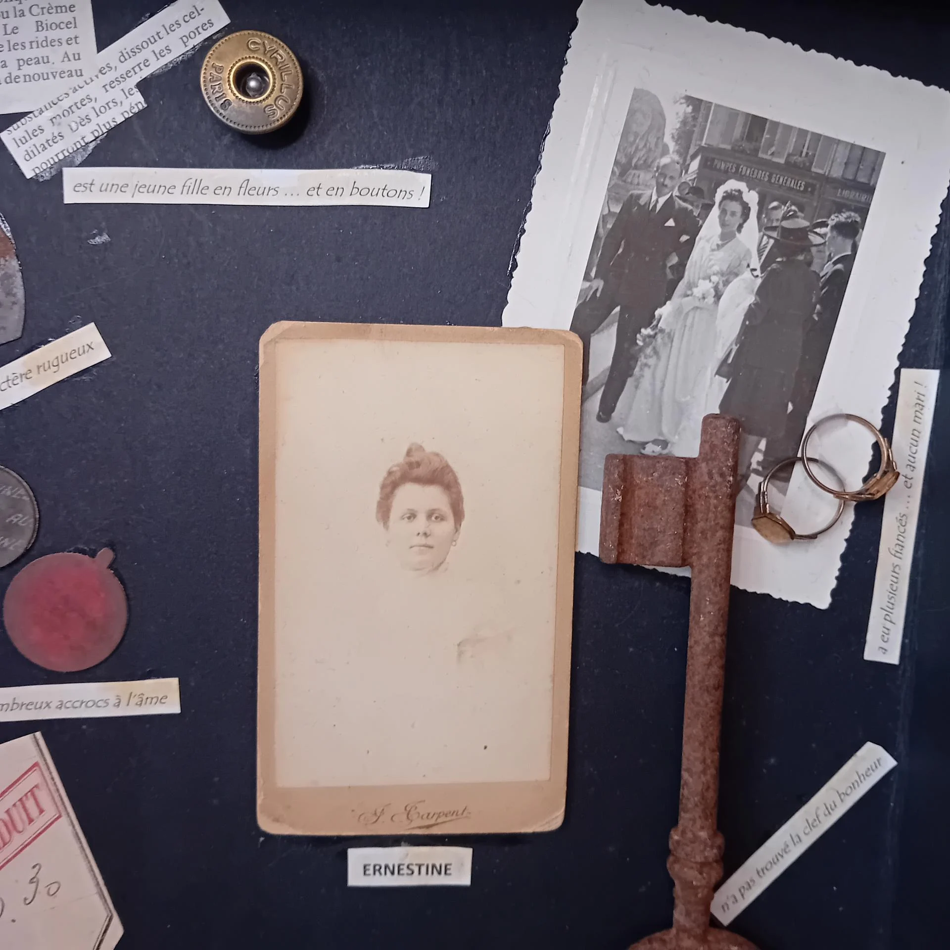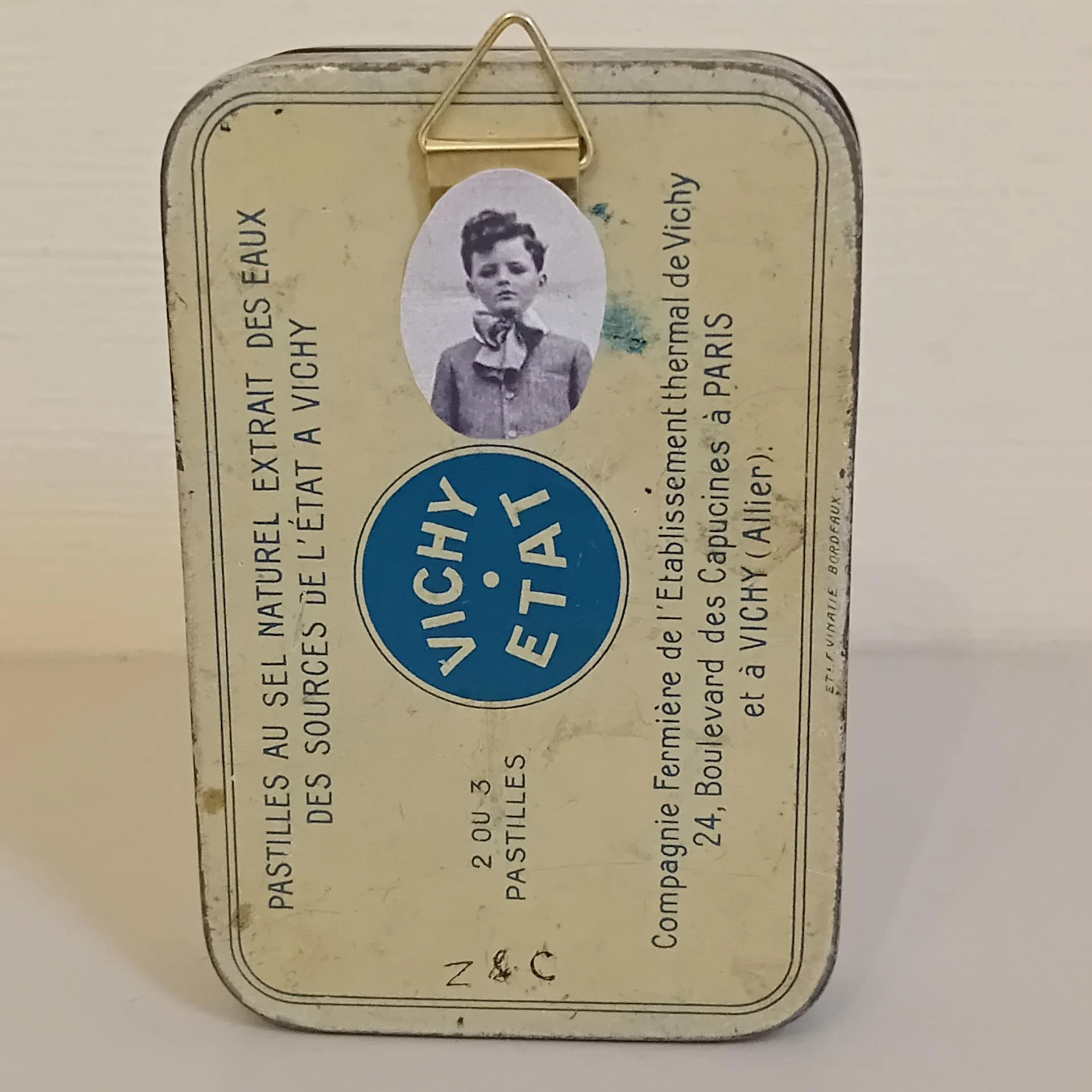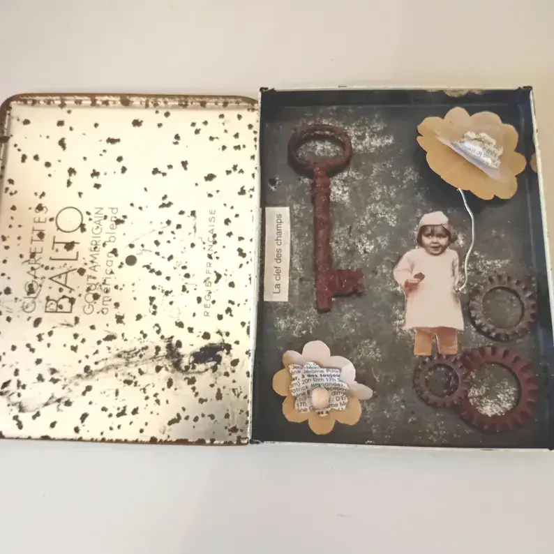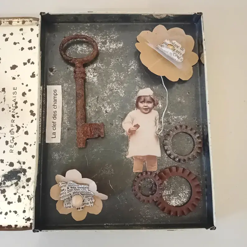 Boîte en métal (vintage), photo ancienne, pages de journaux, carton, perles de bois, clef ancienne, rondelles de métal.