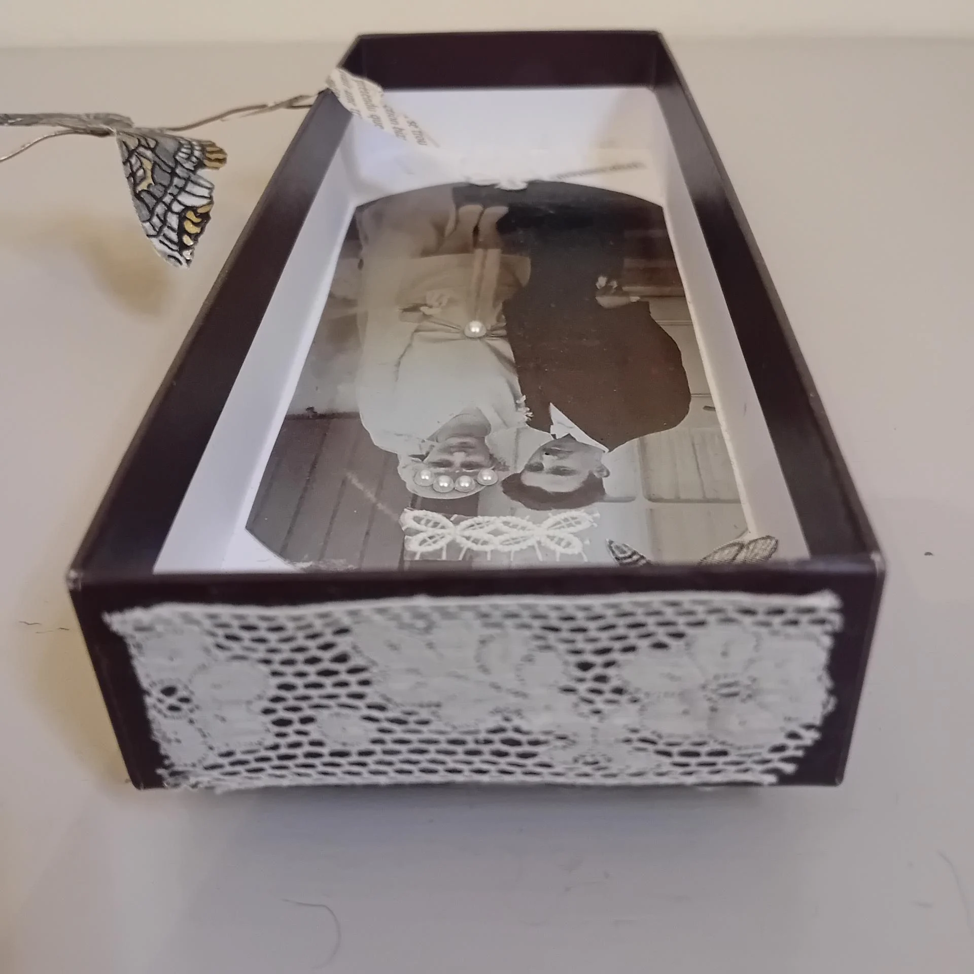 Boîte en carton, photo ancienne, dentelle ancienne, pages de journaux (vintage), strass, illustrations.