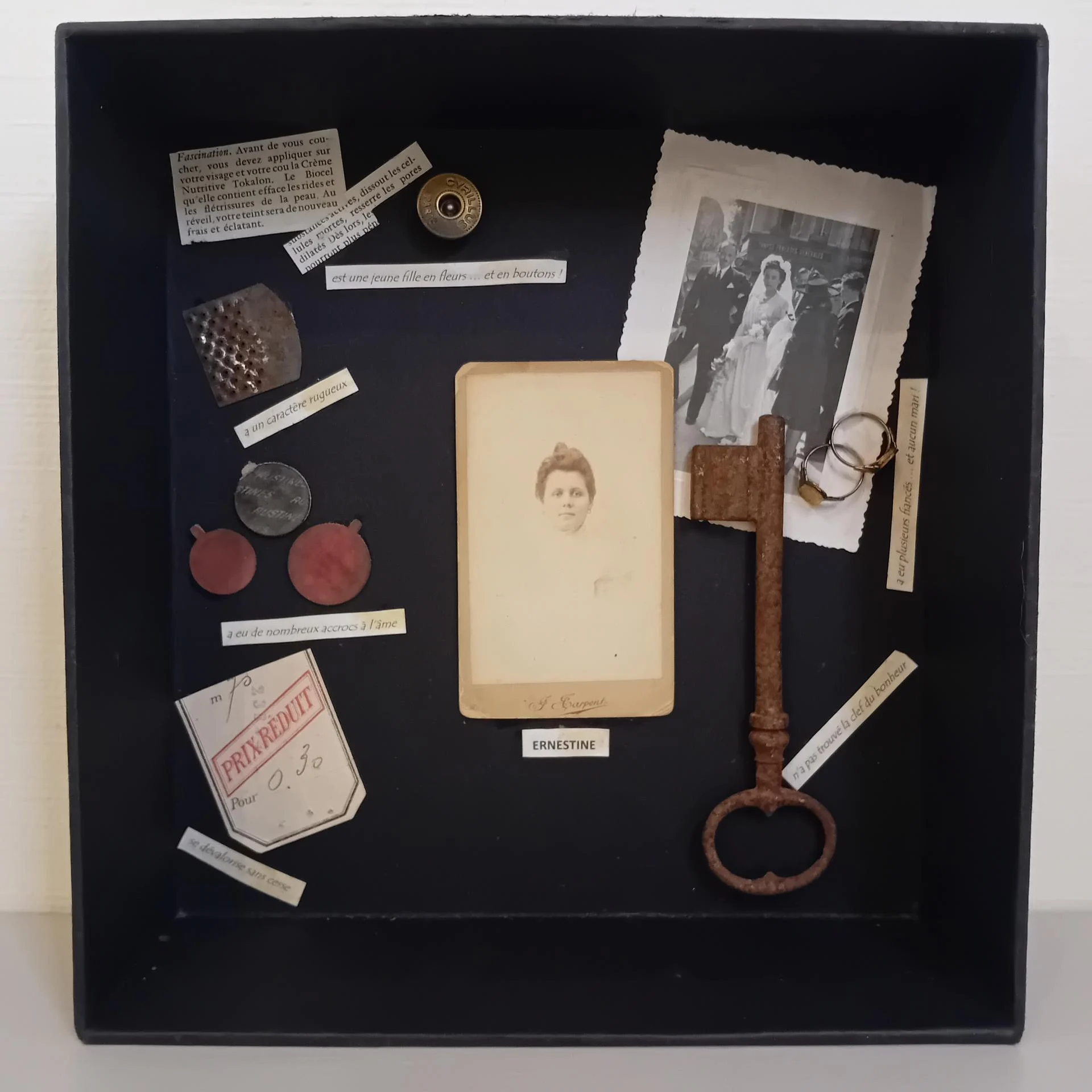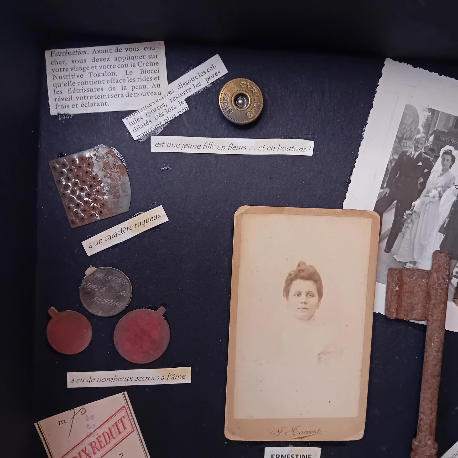 Boîte en carton, photos anciennes, clef ancienne, rondelles de métal, étiquette vintage, papier, objets divers en métal.