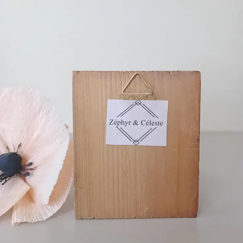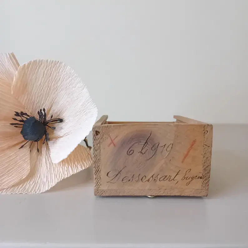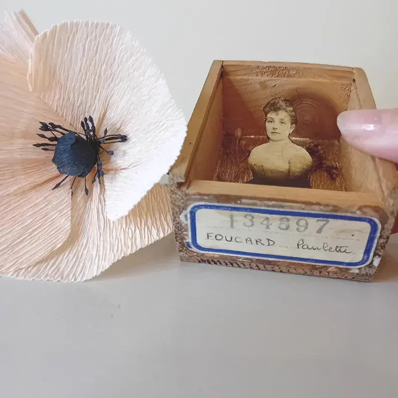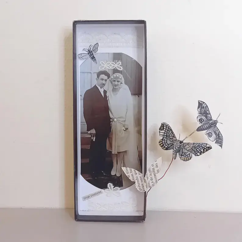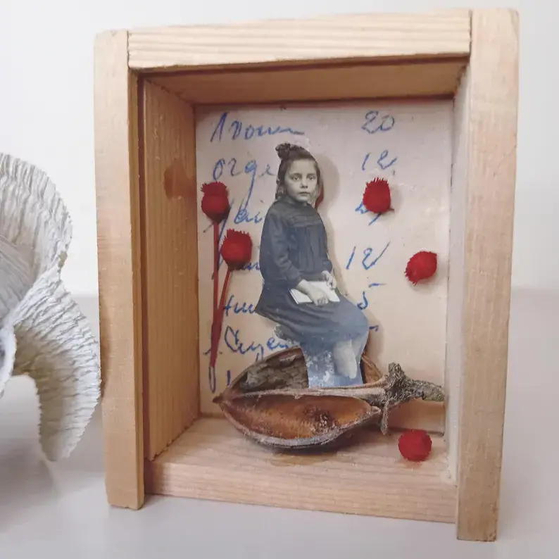 Boîte à bons points (vintage), photo ancienne, végétaux séchés, papier crépon doré.