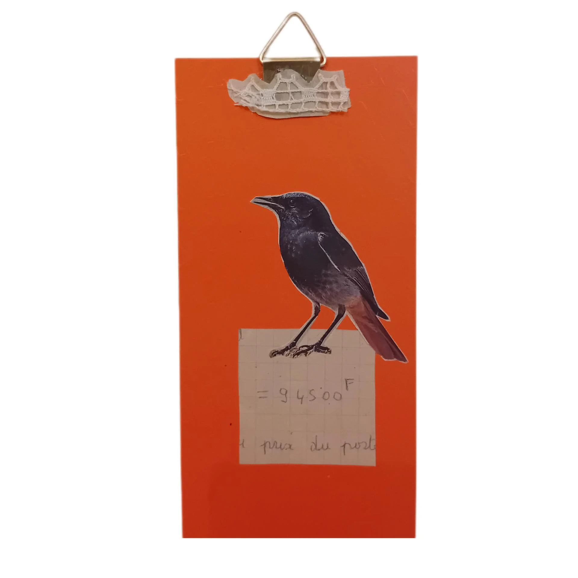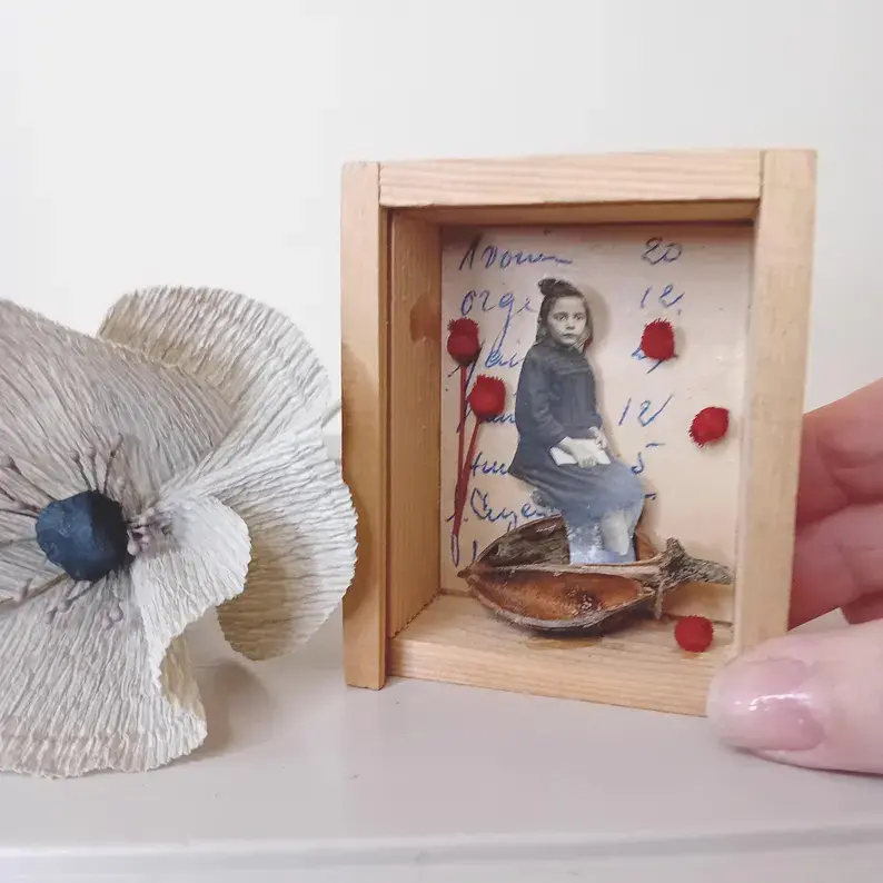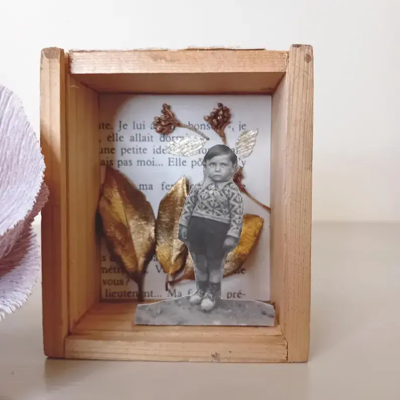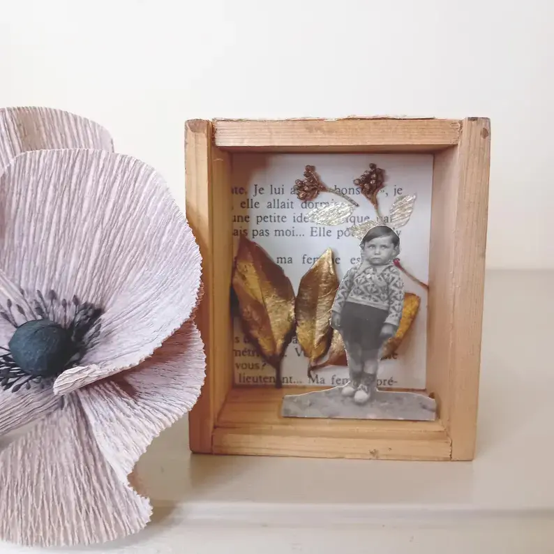 Boîte à bons points, photo ancienne, végétaux séchés (dorés), page de livre, papier crépon doré.