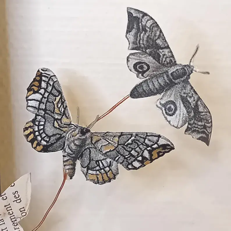 Boîte en métal (vintage), photos anciennes, brodées au fil argenté, message découpé dans un livre, papier, perle nacrée (artificielle).