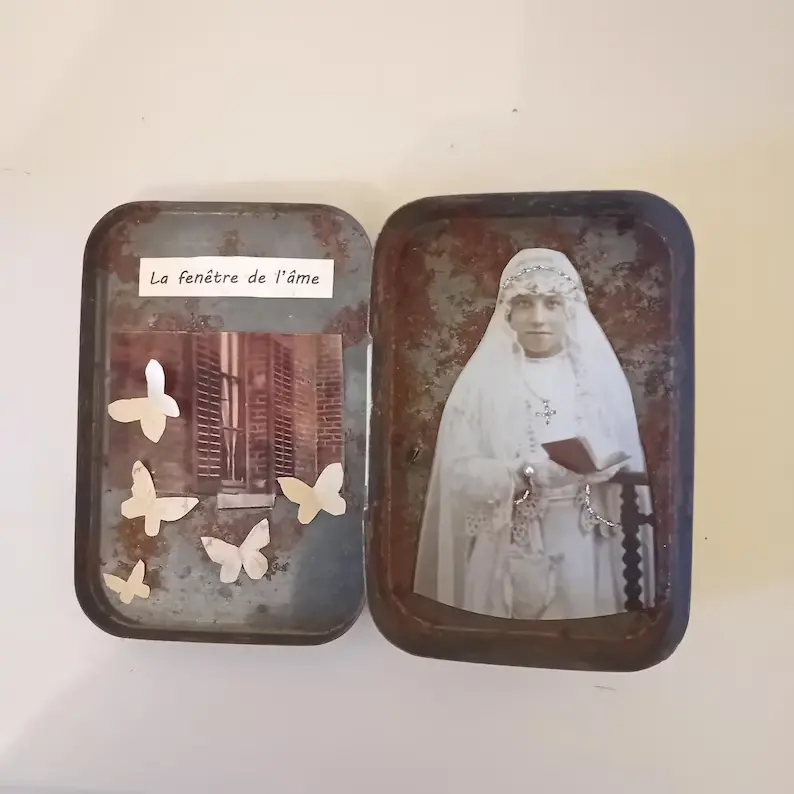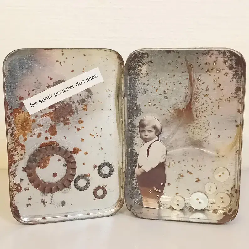 Boîte en métal (vintage), photo ancienne, message découpé dans un livre, plumes, boutons de nacre, perles dorées (laiton), rondelles de métal.