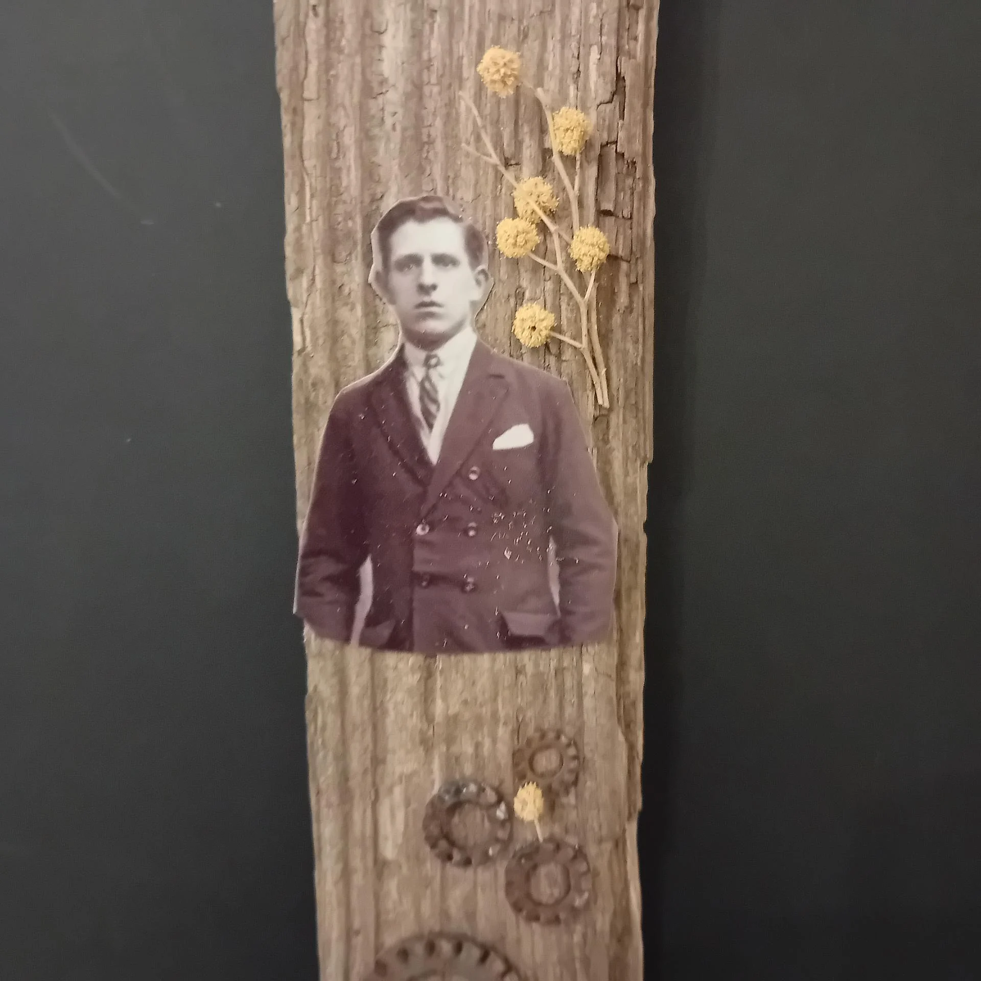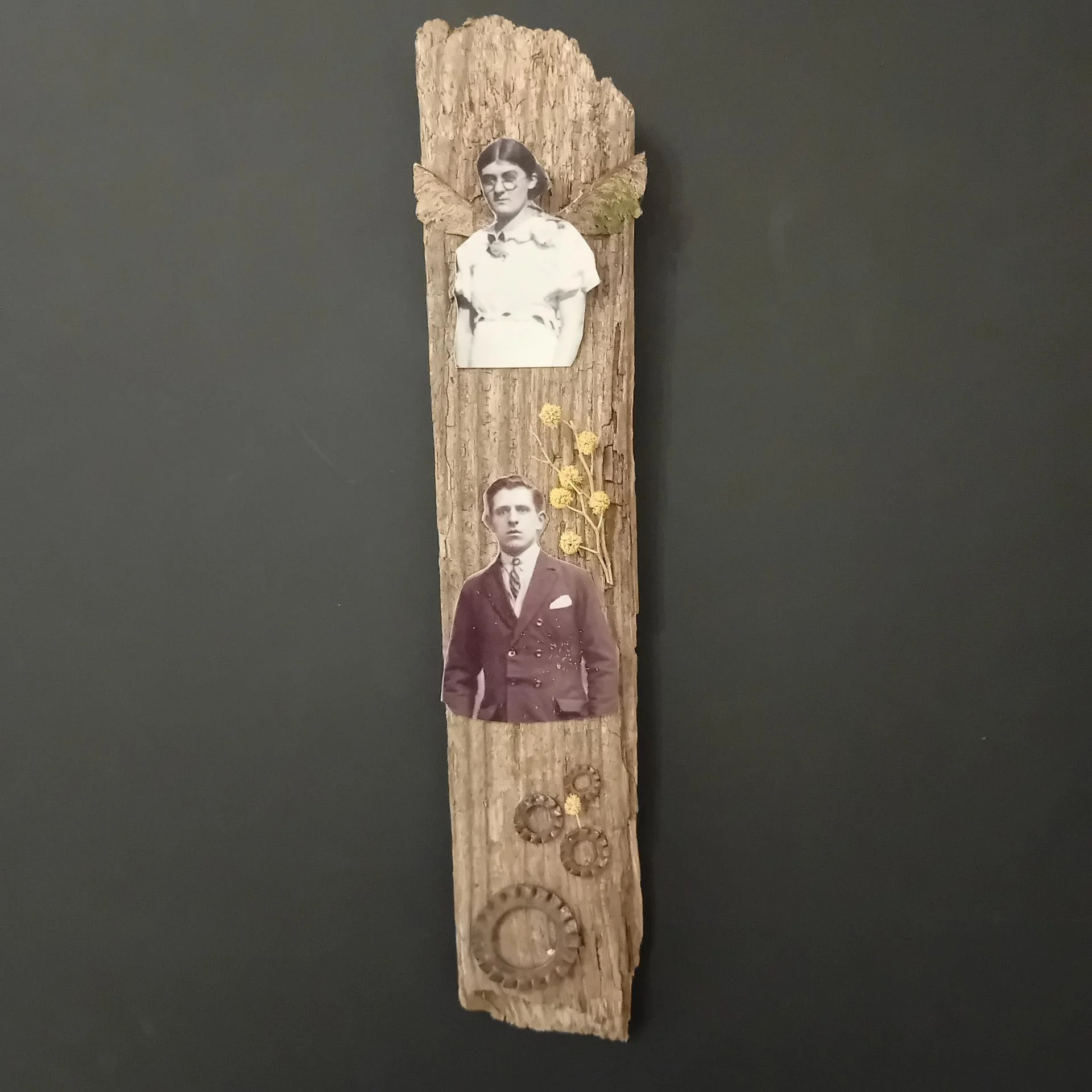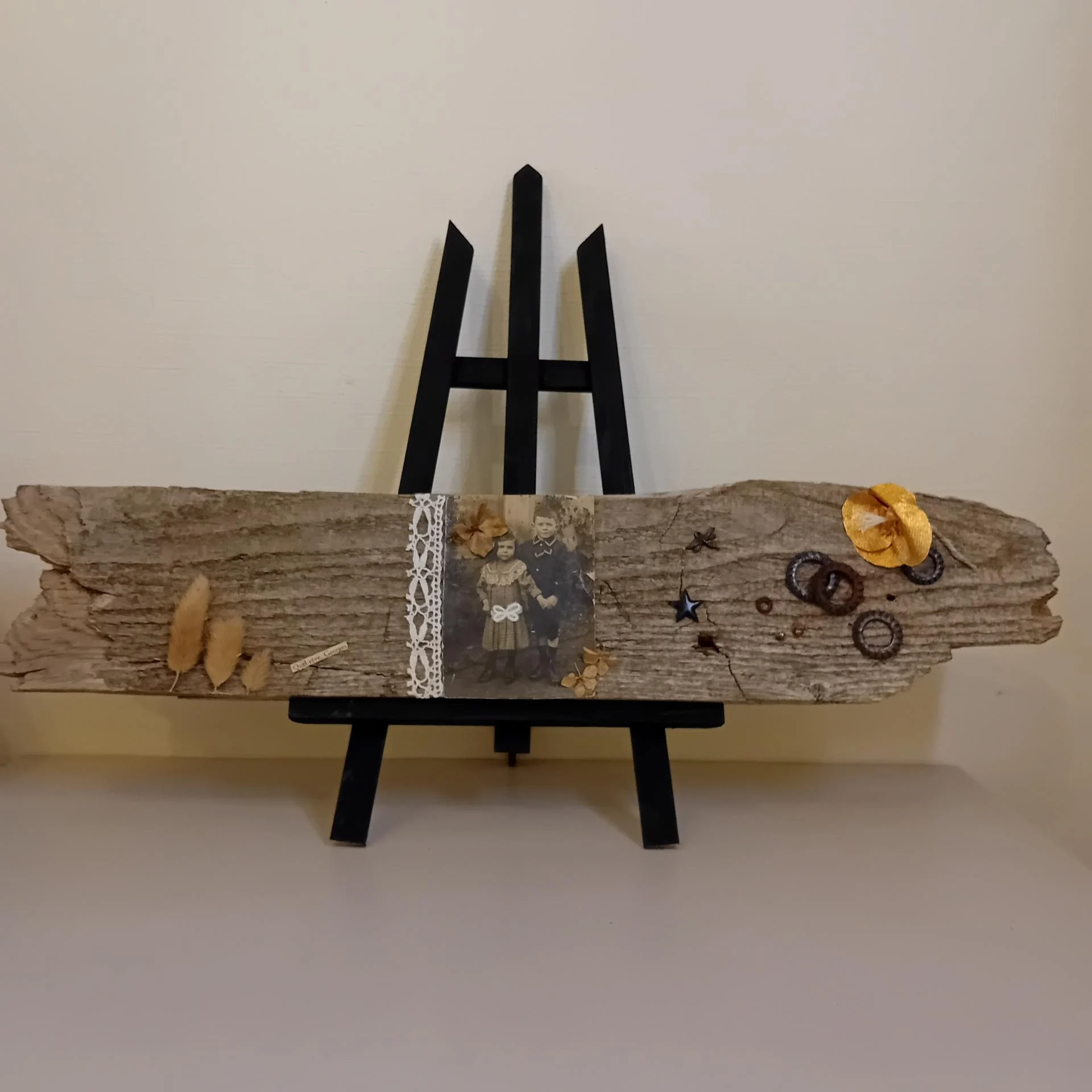 Bois, photos anciennes, végétaux séchés, dentelle ancienne, boulons, bouchon de liège, timbre ancien.