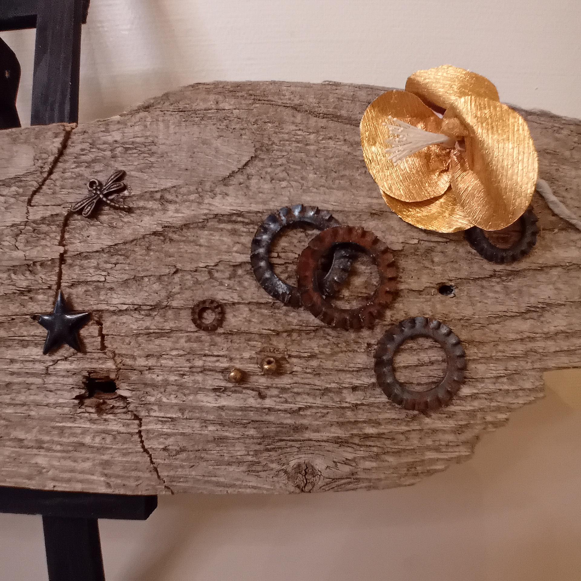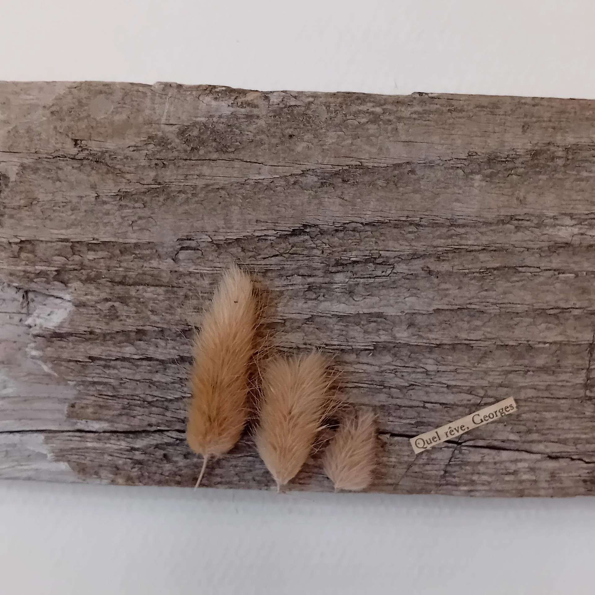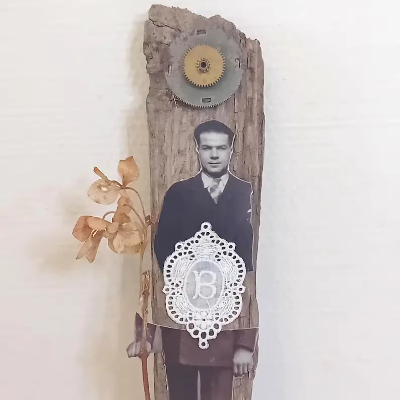 Bois, photos anciennes, végétaux séchés, dentelle ancienne, boulons, bouchon de liège, timbre ancien.