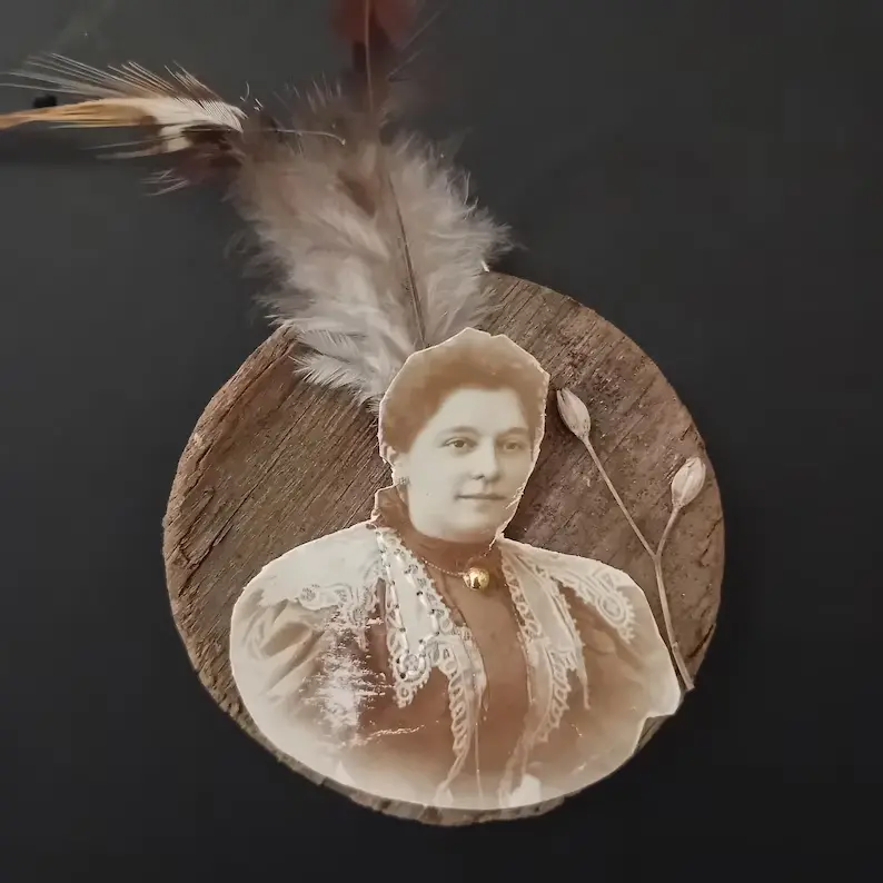 Bois, photo ancienne brodée, végétaux séchés, plume, perle dorée (laiton), timbre ancien.