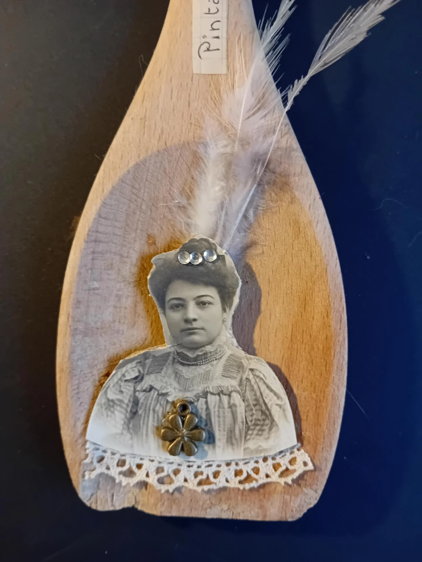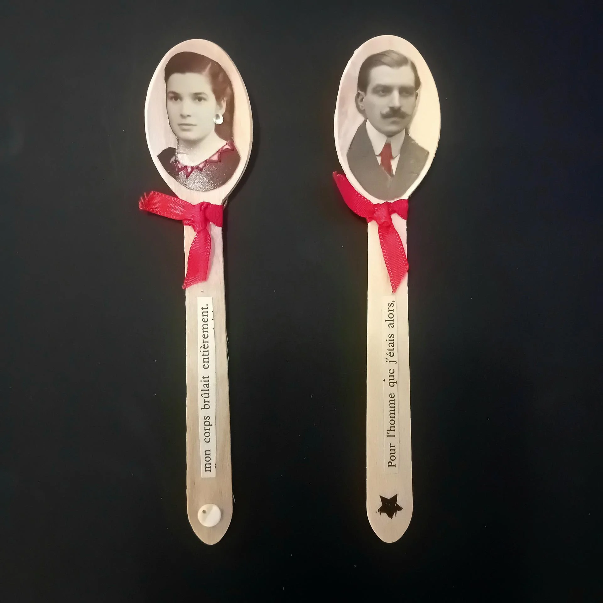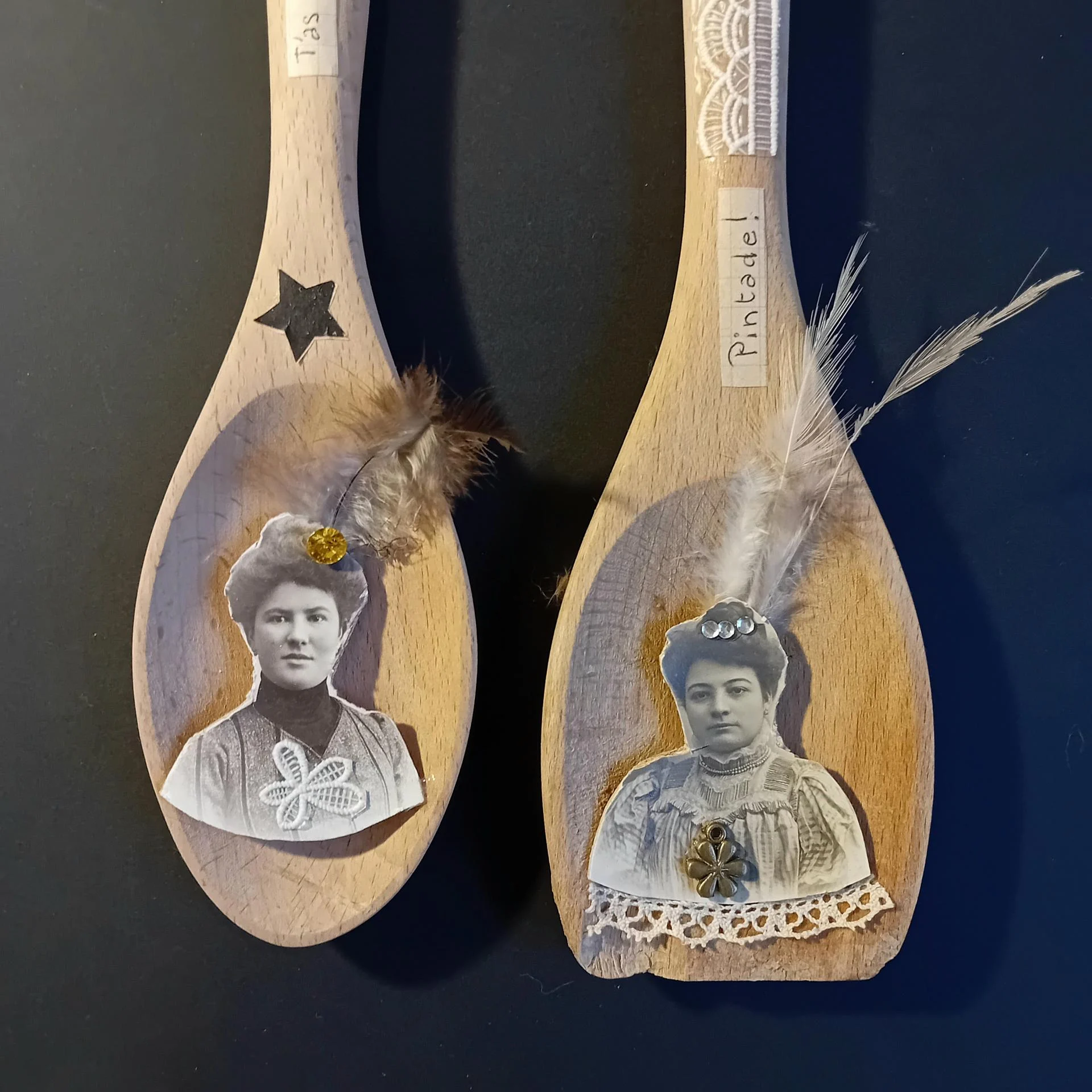 Cuillères en bois, photos anciennes brodées et retouchées à la peinture, rubans, strass, bouton de nacre, papier.