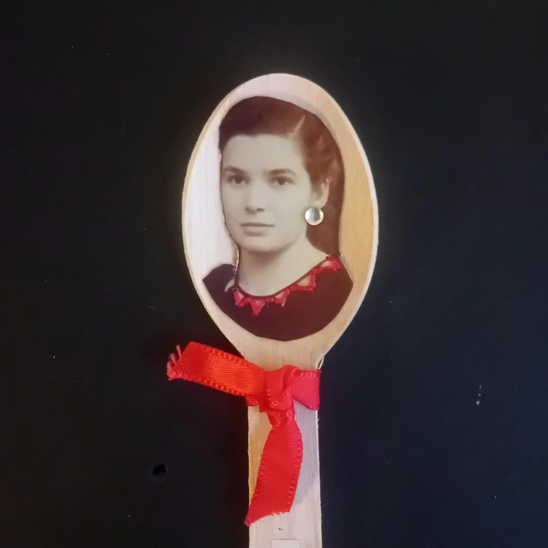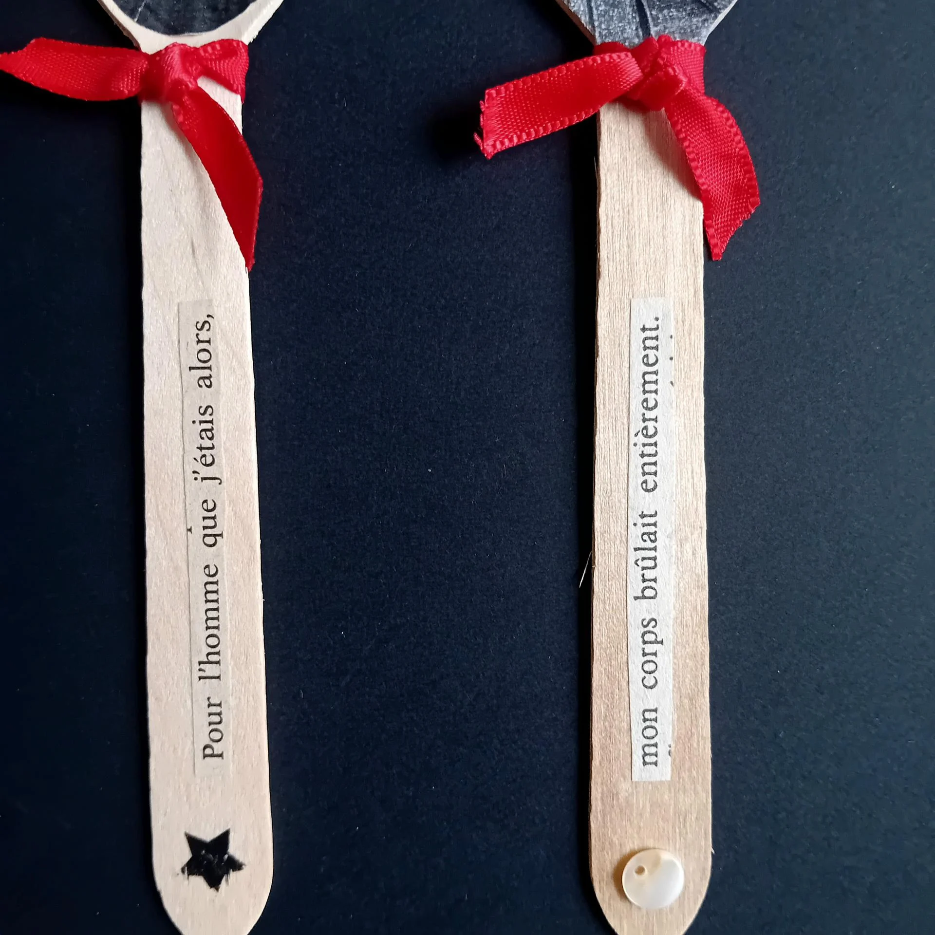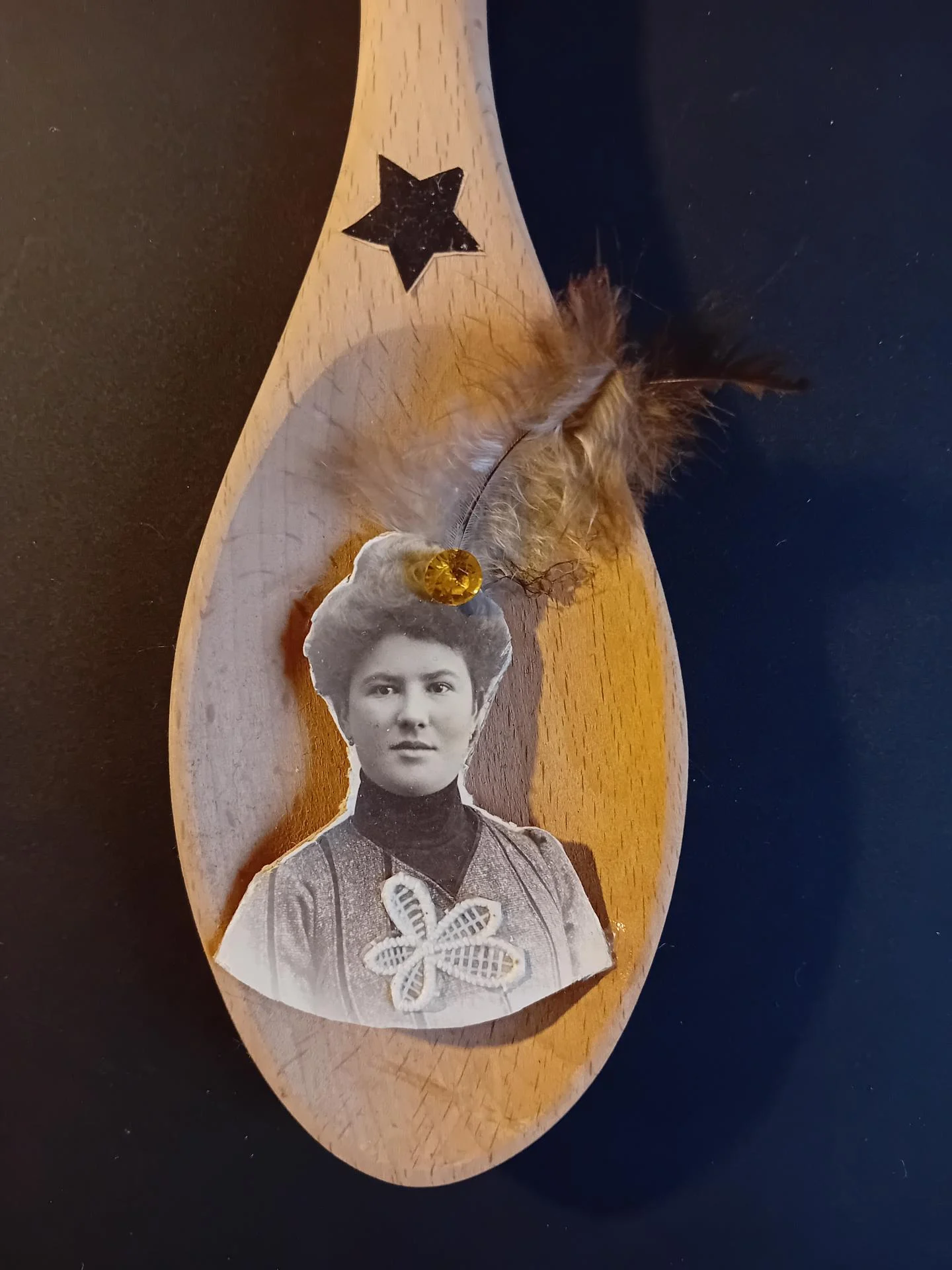 Cuillères en bois, photos anciennes brodées et retouchées à la peinture, rubans, strass, bouton de nacre, papier.