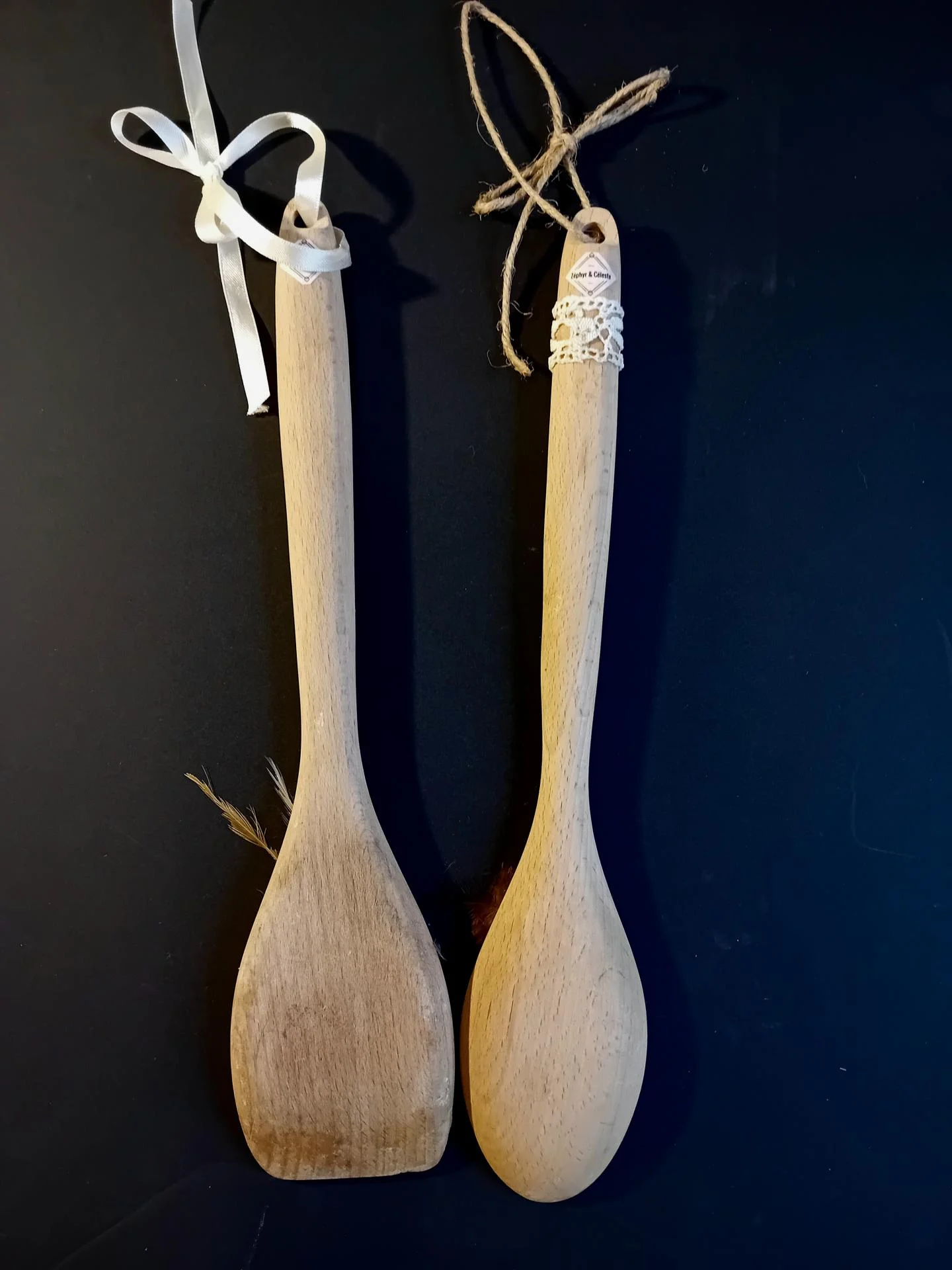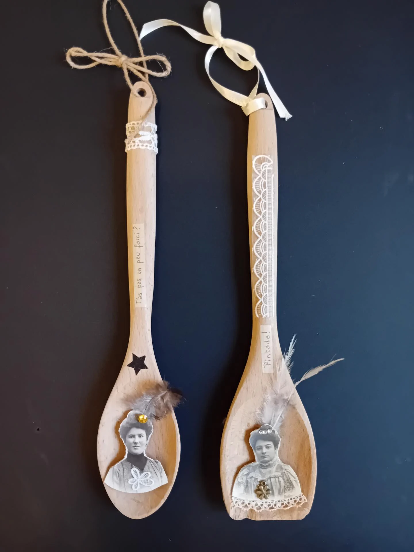 Cuillères en bois, photos anciennes, plumes, strass, dentelle vintage, dentelle plastifiée, charm's en laiton, papier.