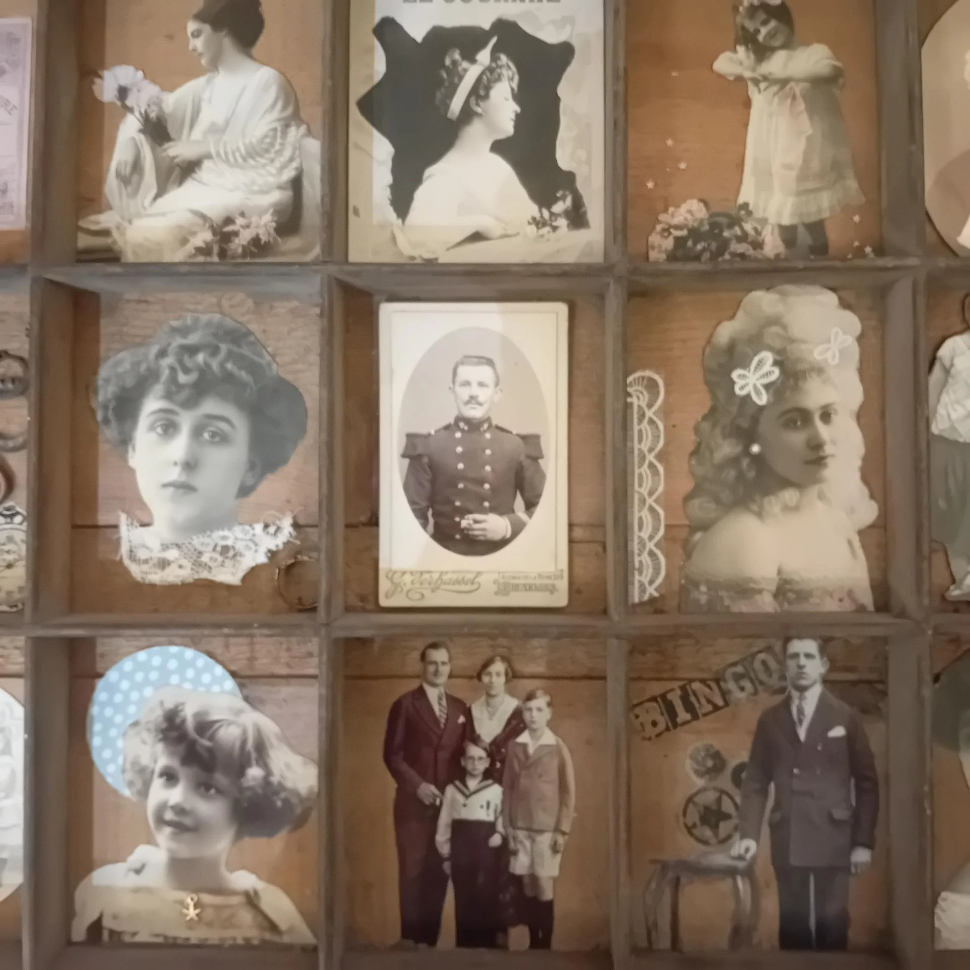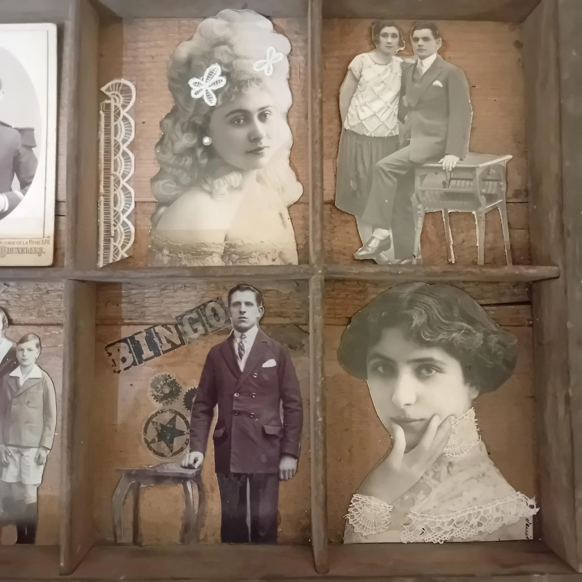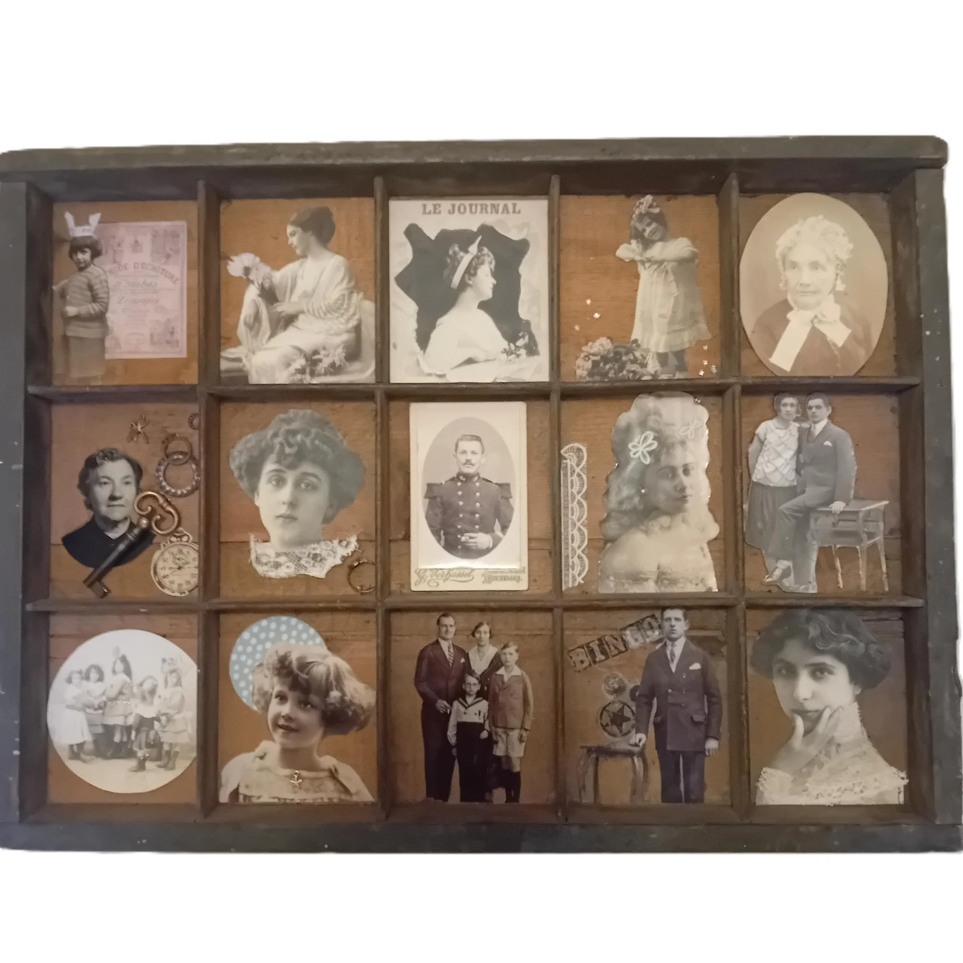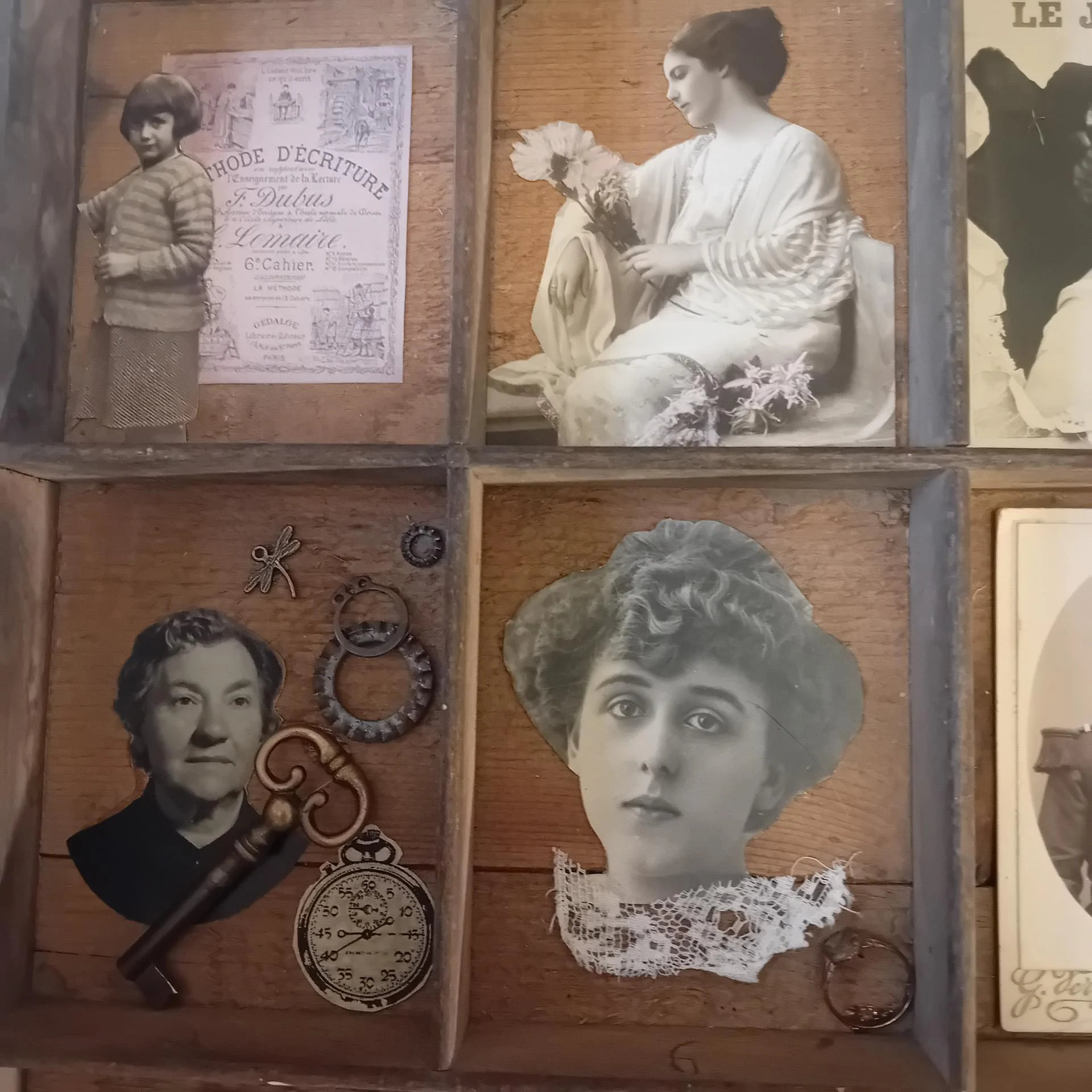 Tiroir à casiers vintage (bois), photos anciennes, illustrations, tissus, dentelle ancienne, dentelle plastifiée, perle nacrée (artificielle), décalcomanies, papier, objets divers (clef ancienne, charm's en laiton, écrous, bague vintage).