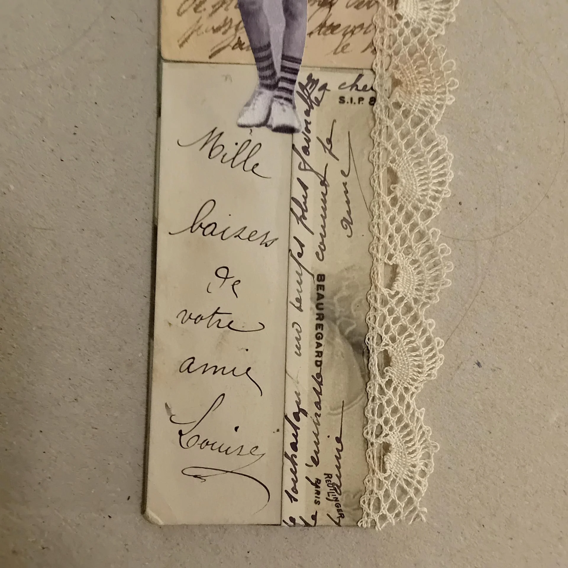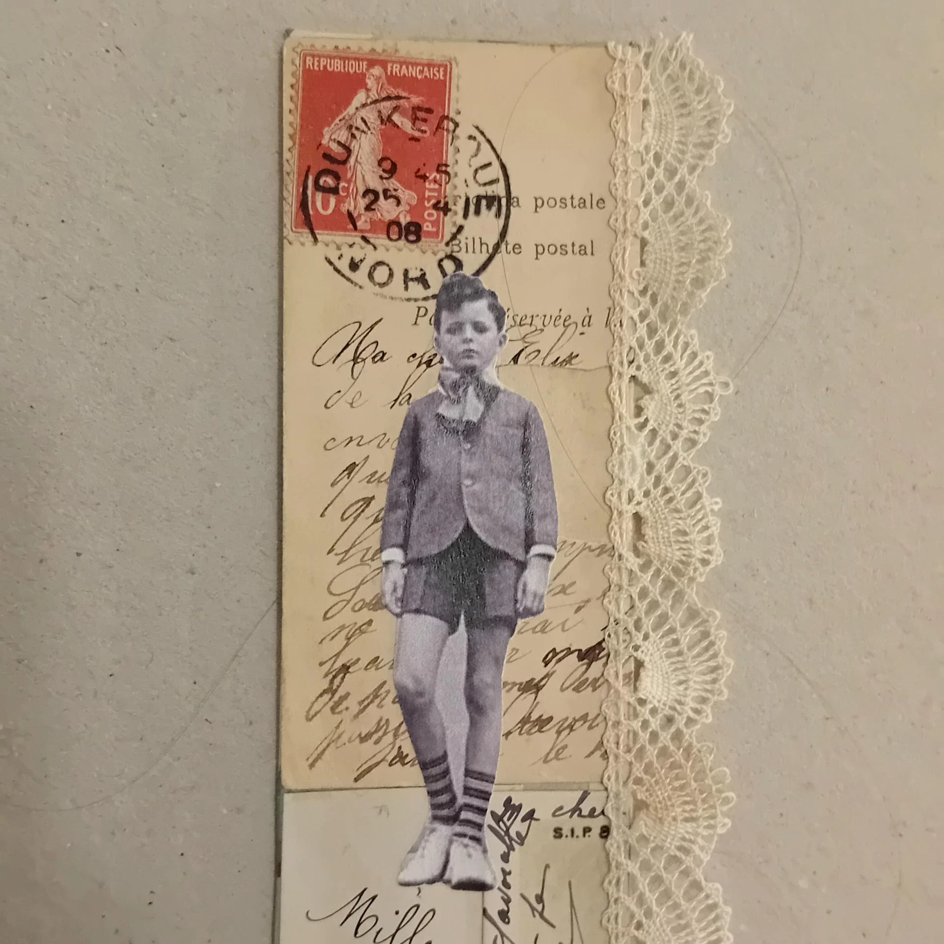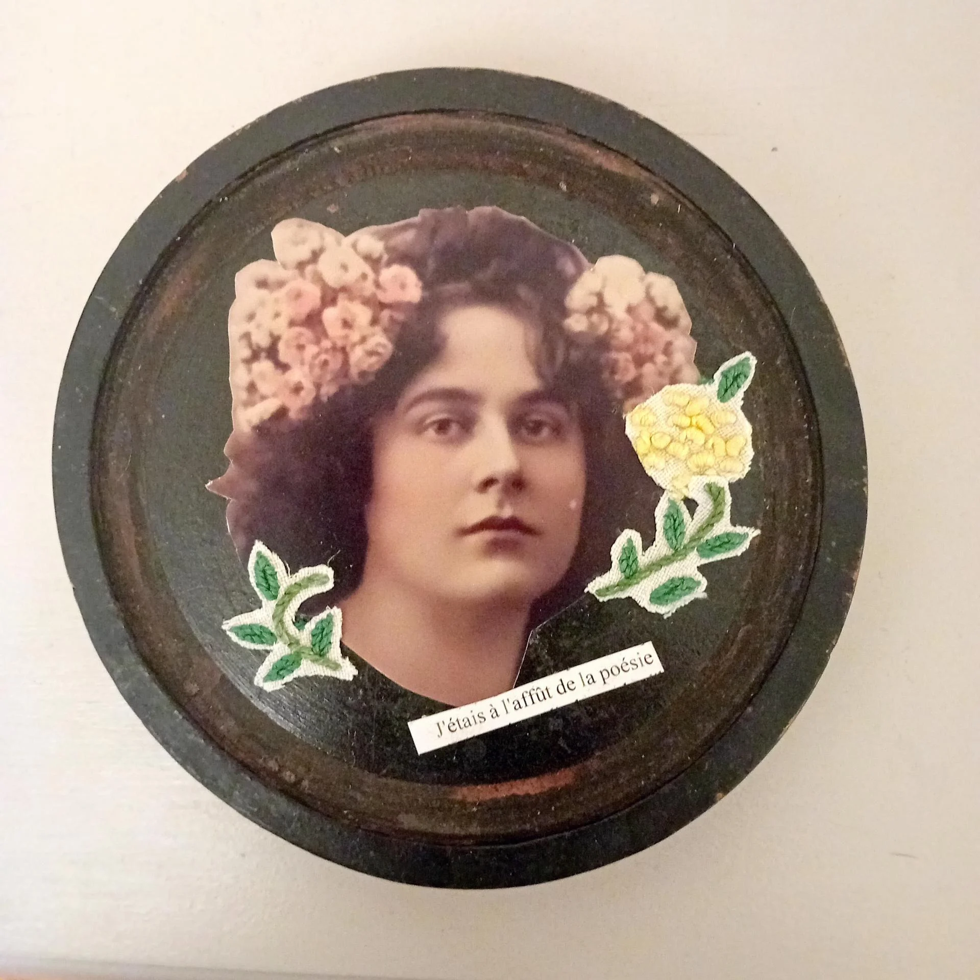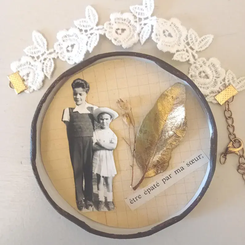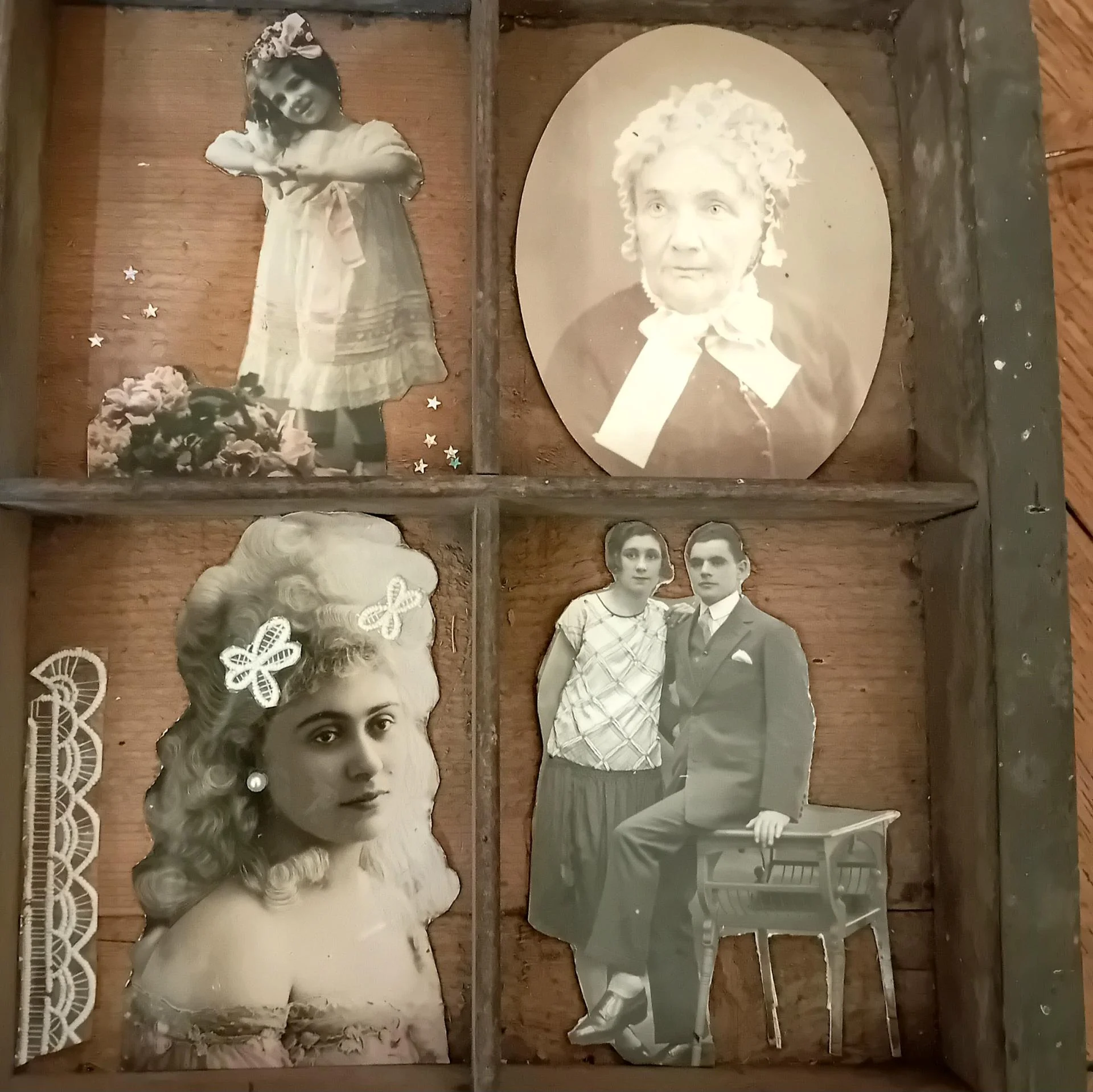 Tiroir à casiers vintage (bois), photos anciennes, illustrations, tissus, dentelle ancienne, dentelle plastifiée, perle nacrée (artificielle), décalcomanies, papier, objets divers (clef ancienne, charm's en laiton, écrous, bague vintage).