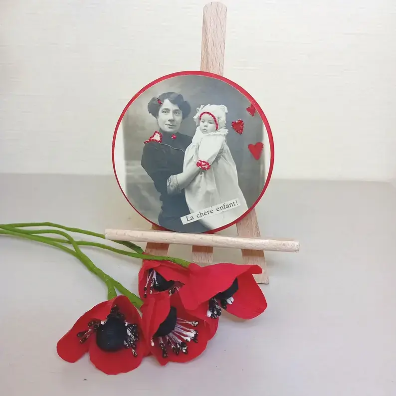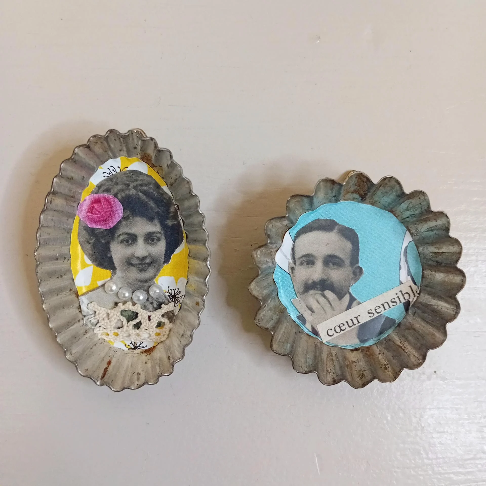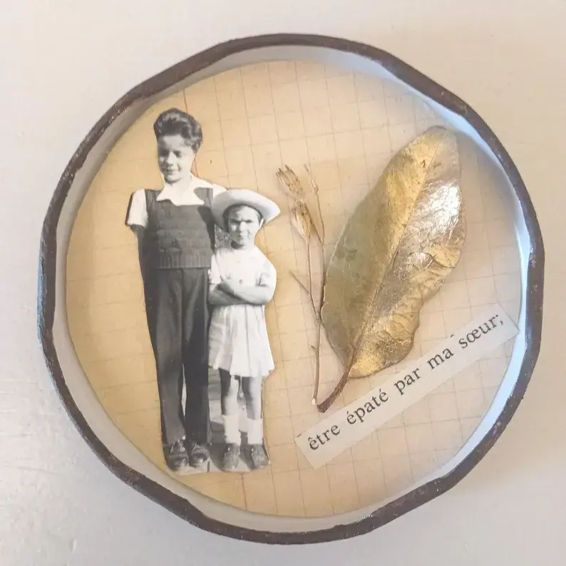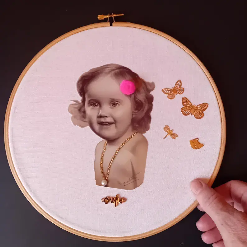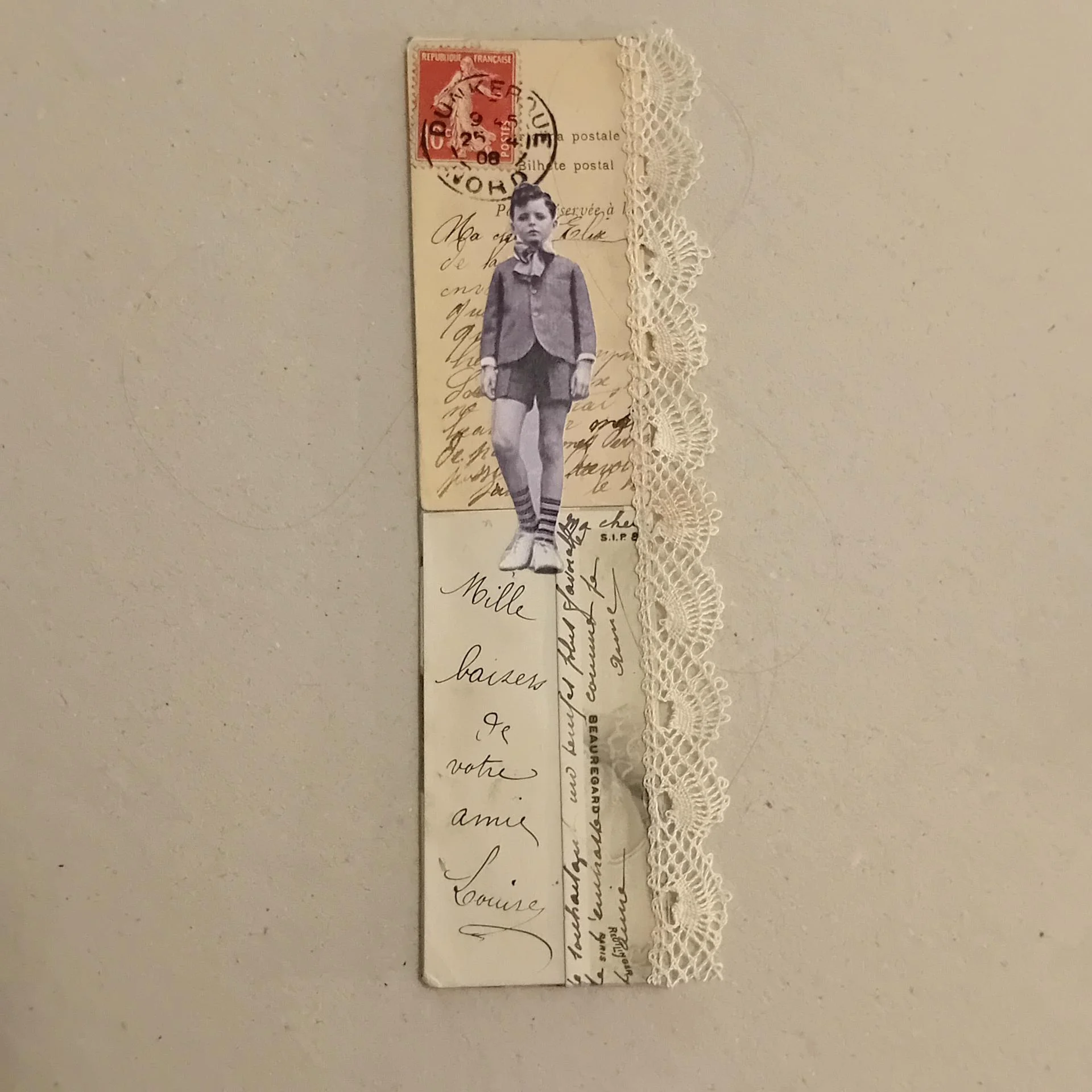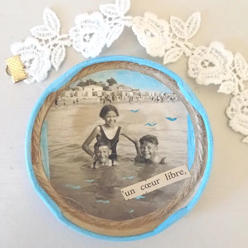 Tiroir à casiers vintage (bois), photos anciennes, illustrations, tissus, dentelle ancienne, dentelle plastifiée, perle nacrée (artificielle), décalcomanies, papier, objets divers (clef ancienne, charm's en laiton, écrous, bague vintage).
