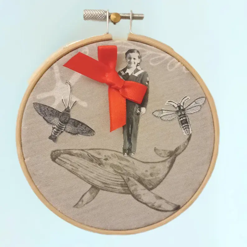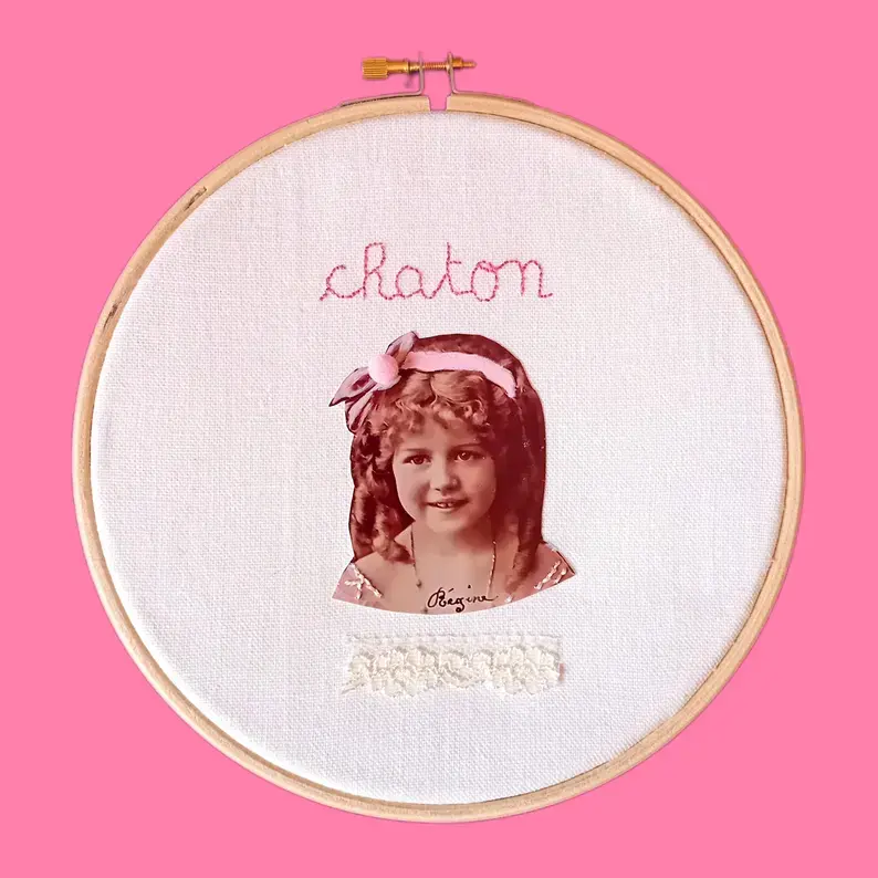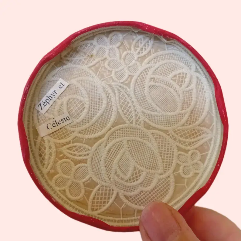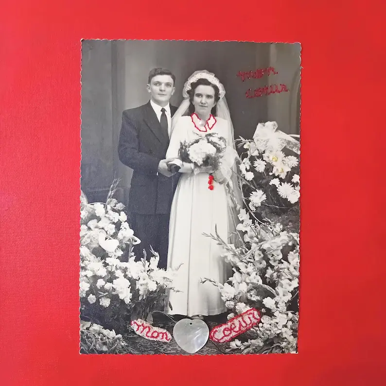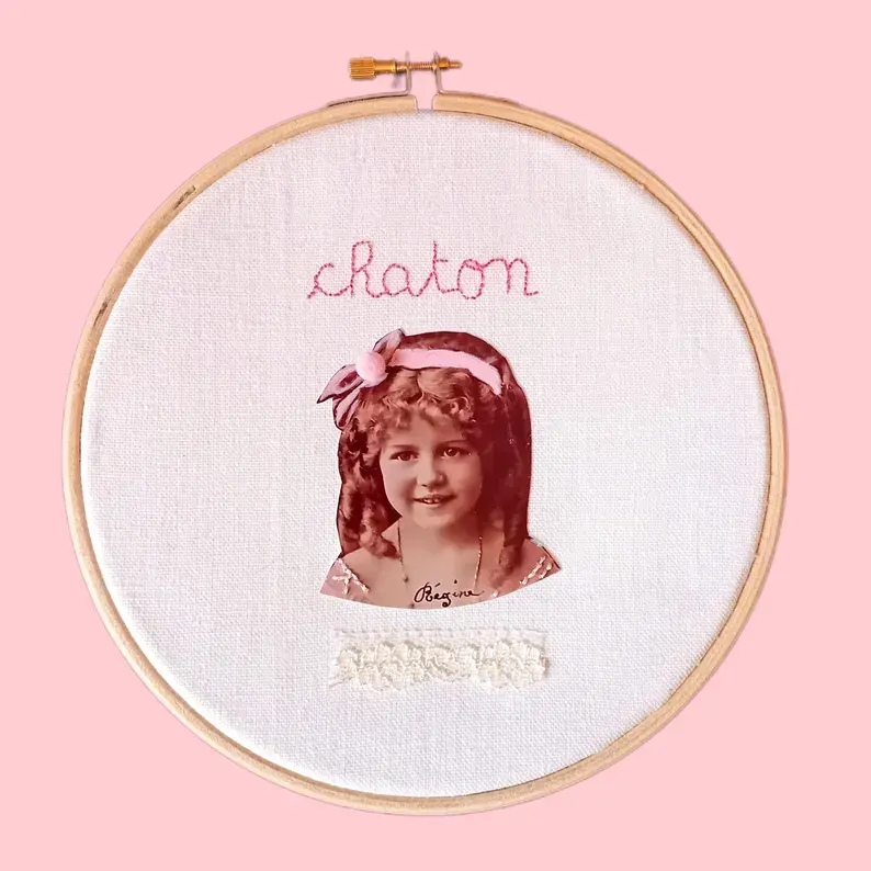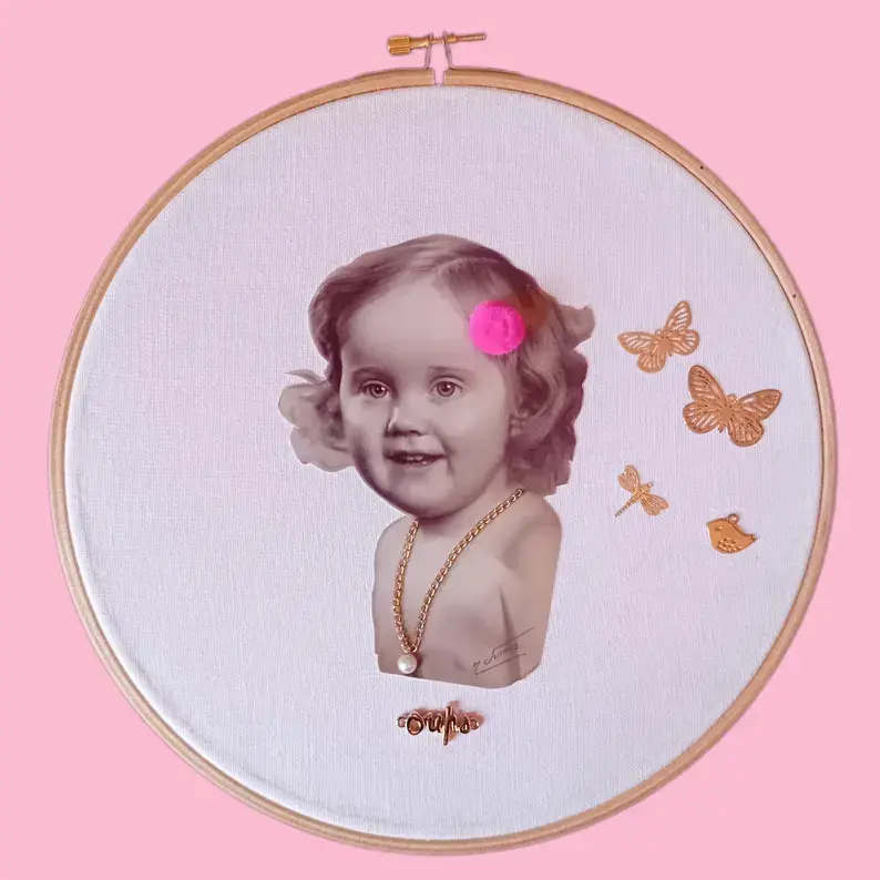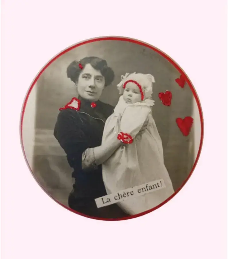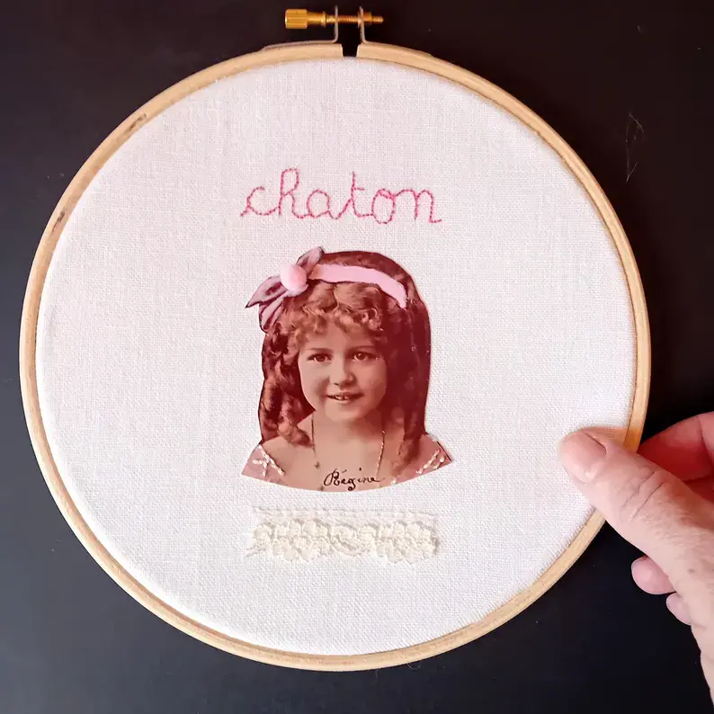 Tiroir à casiers vintage (bois), photos anciennes, illustrations, tissus, dentelle ancienne, dentelle plastifiée, perle nacrée (artificielle), décalcomanies, papier, objets divers (clef ancienne, charm's en laiton, écrous, bague vintage).