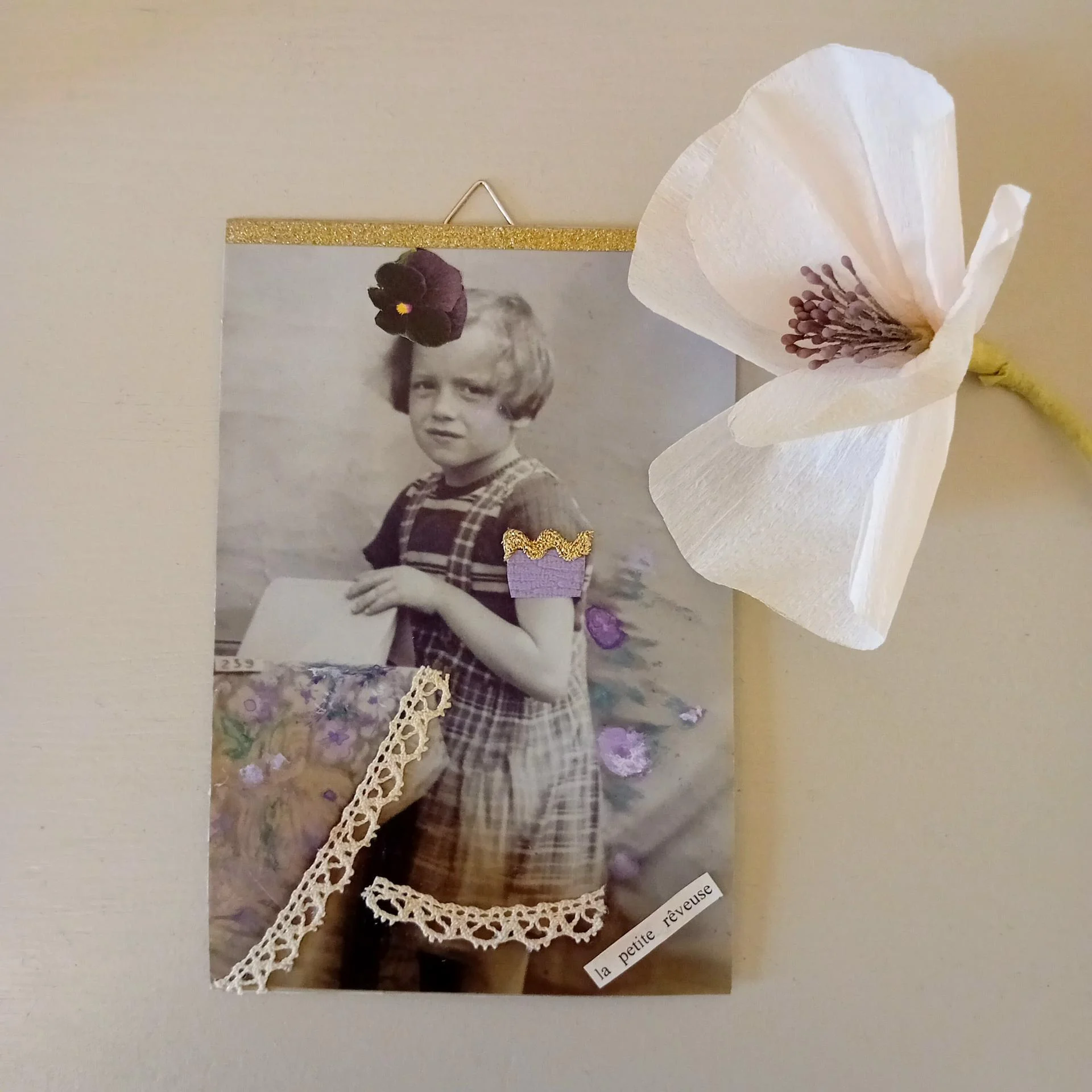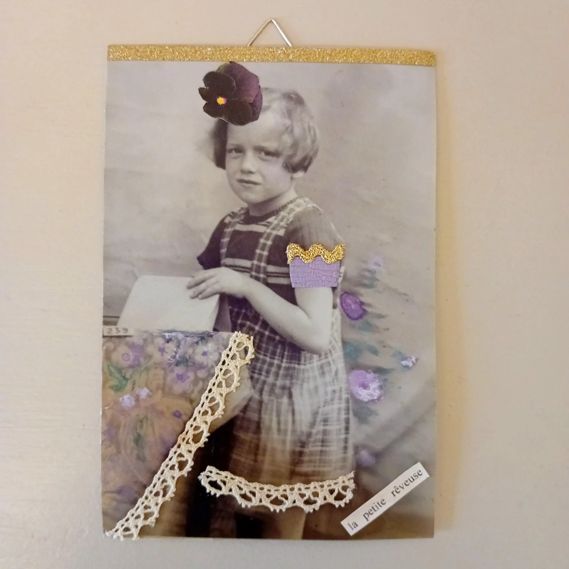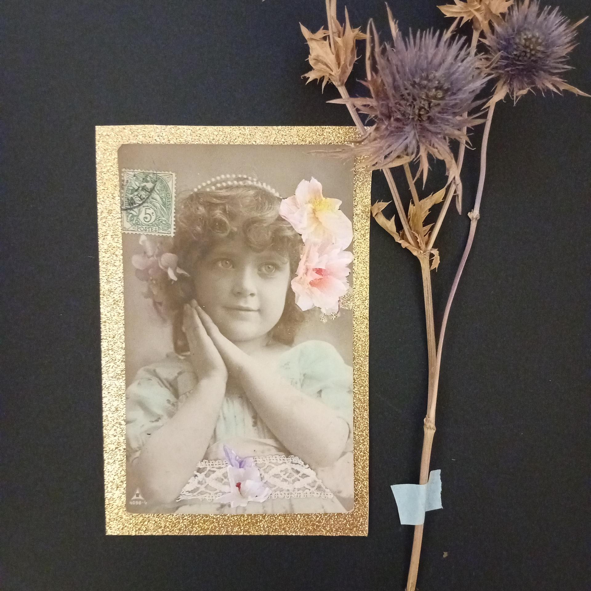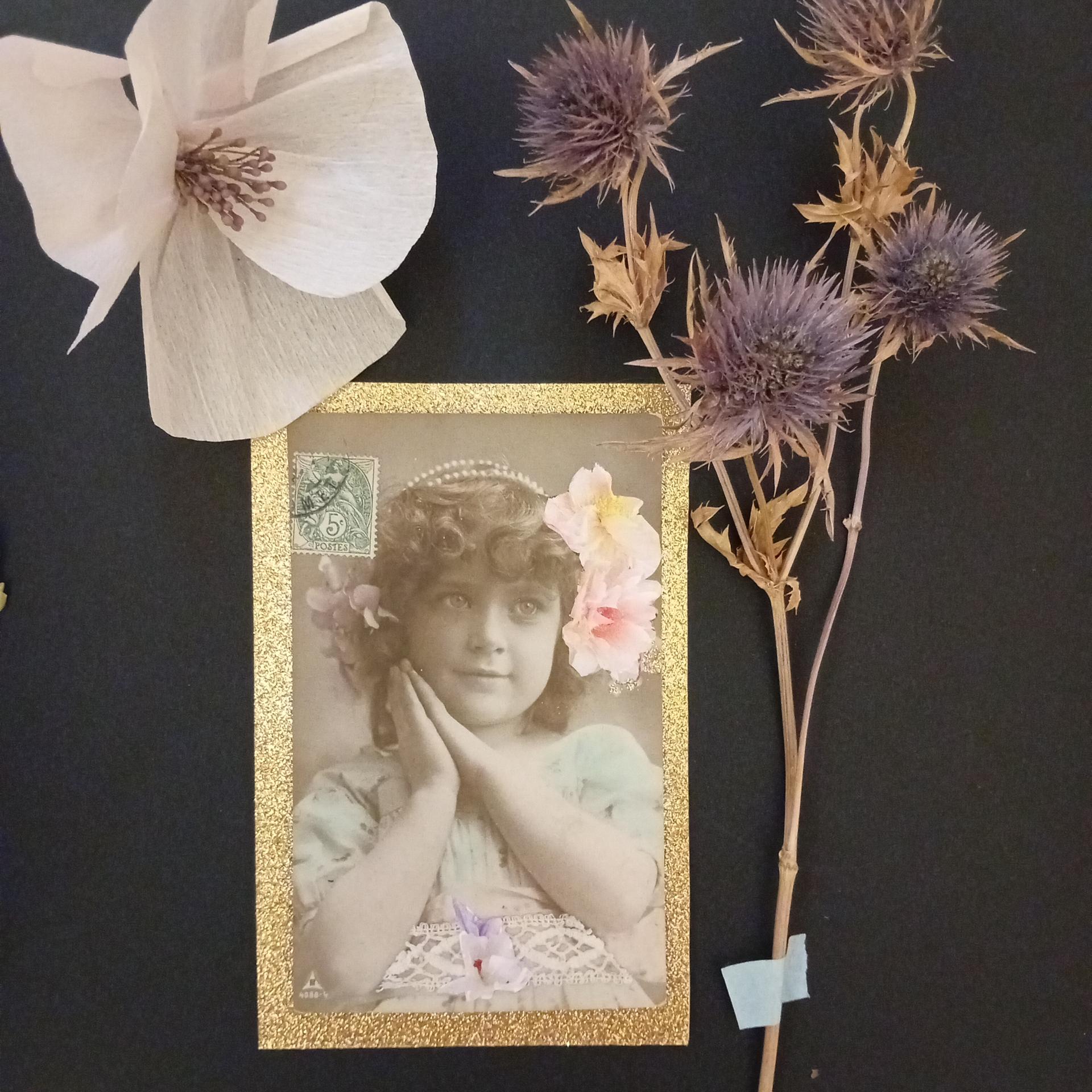 Carton, photo ancienne (retouchée à la peinture), dentelle vintage, illustrations, papier doré pailleté, ruban doré, papier.