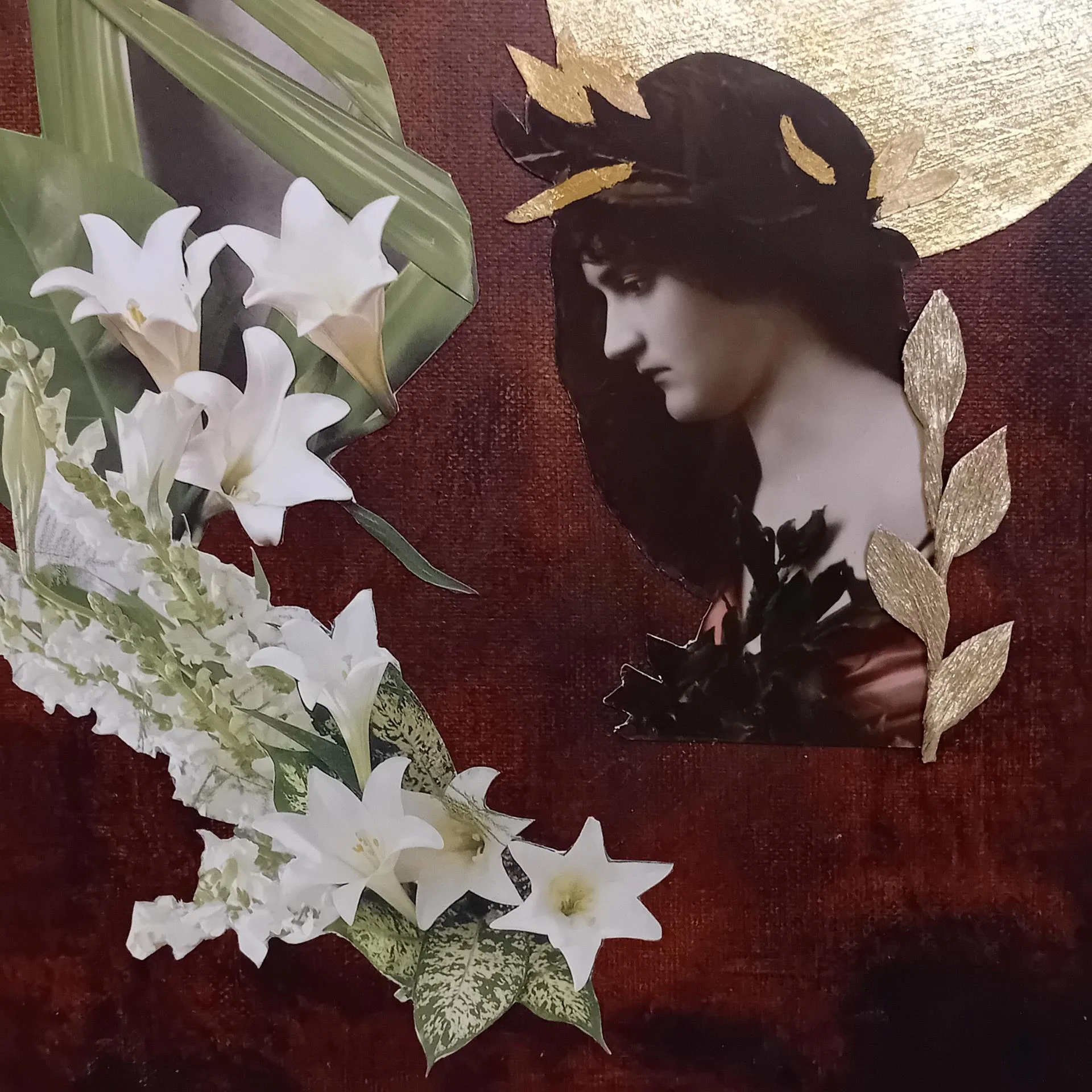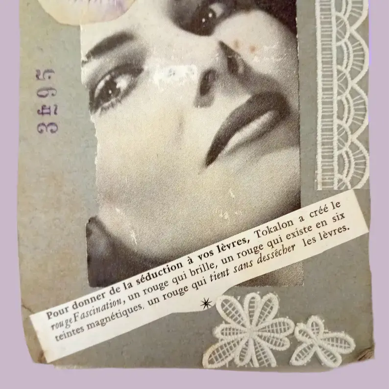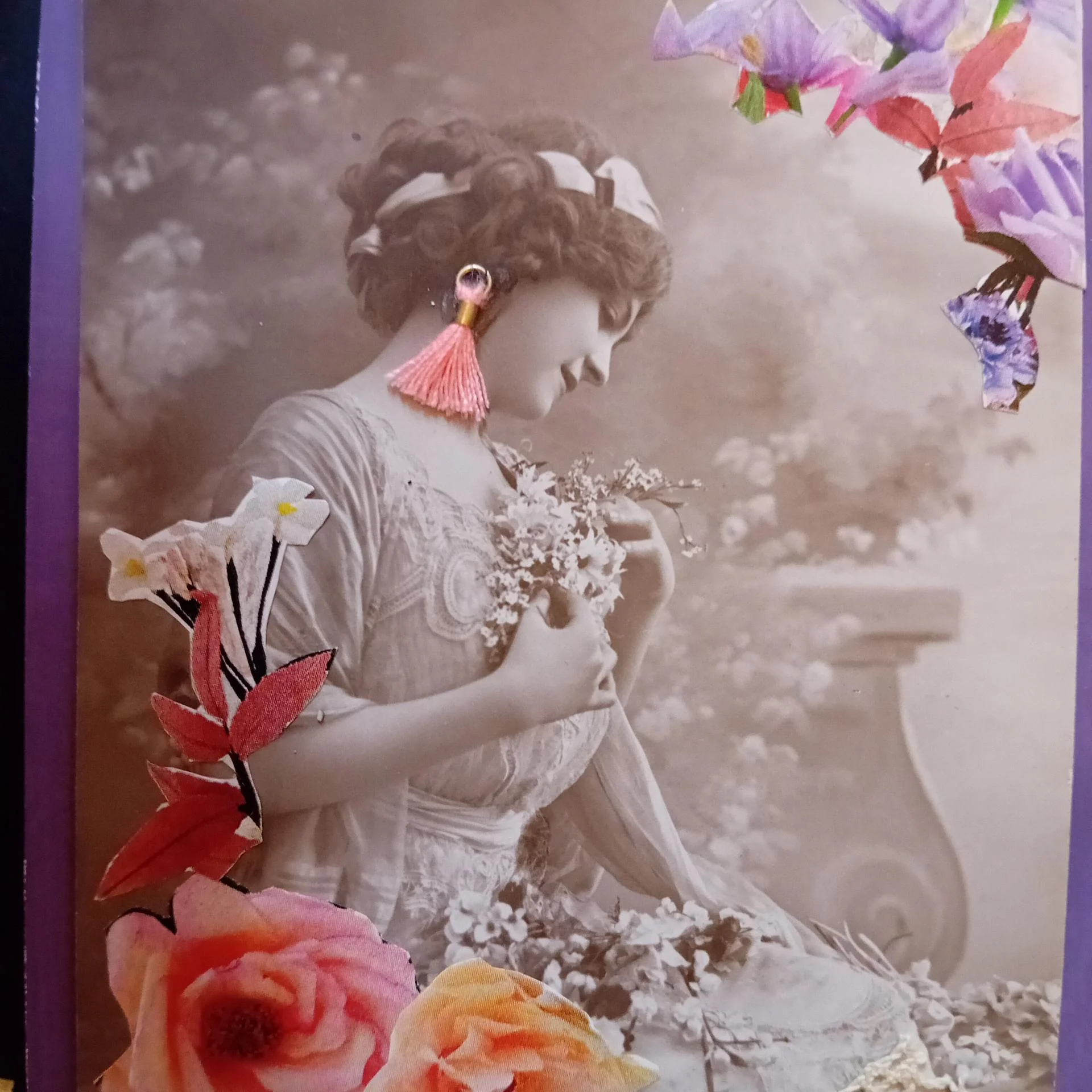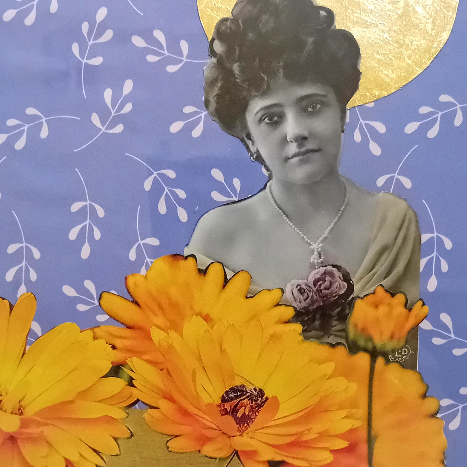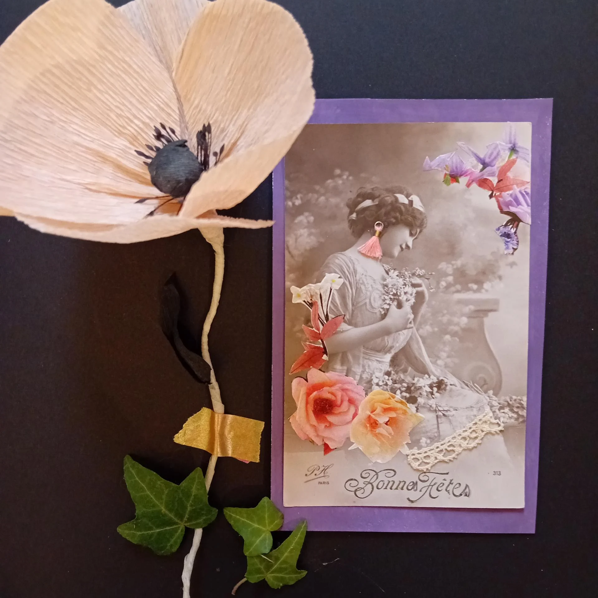 Carton, photo ancienne (retouchée à la peinture), dentelle vintage, illustrations, papier doré pailleté, ruban doré, papier.