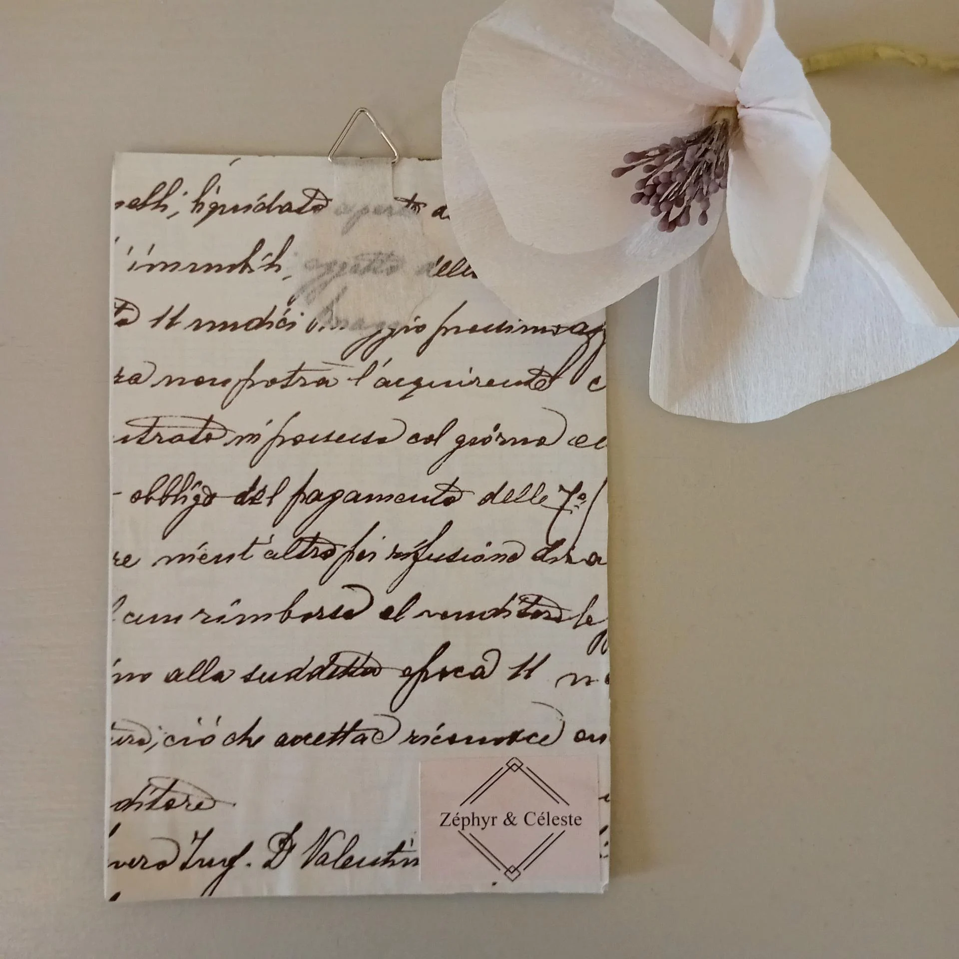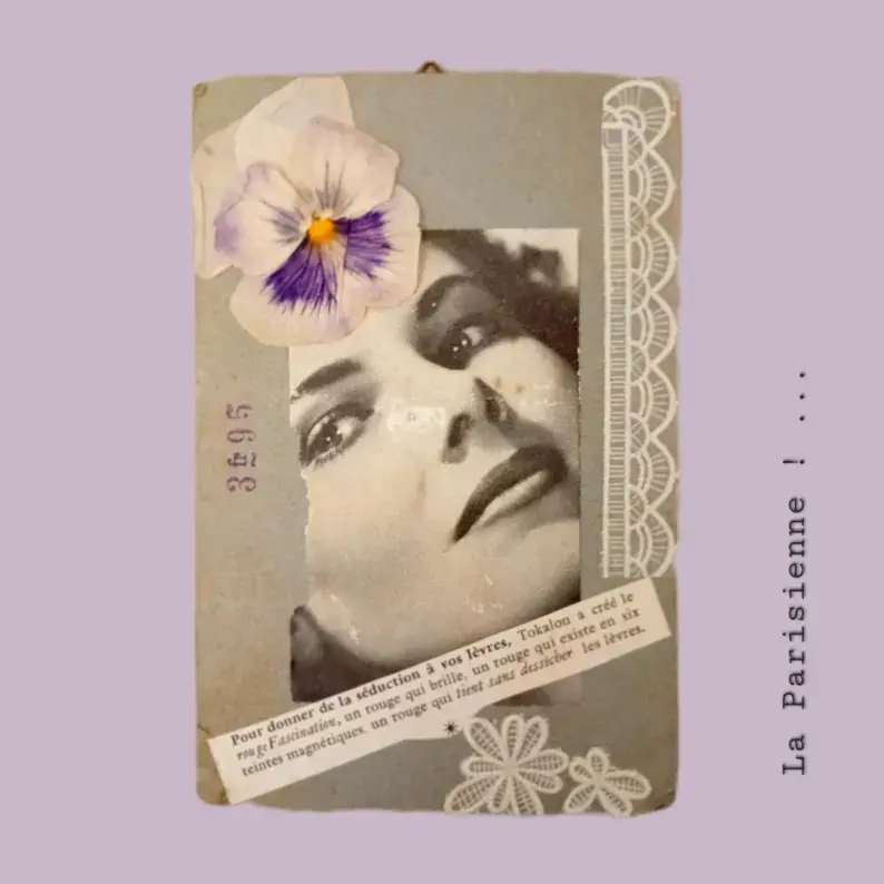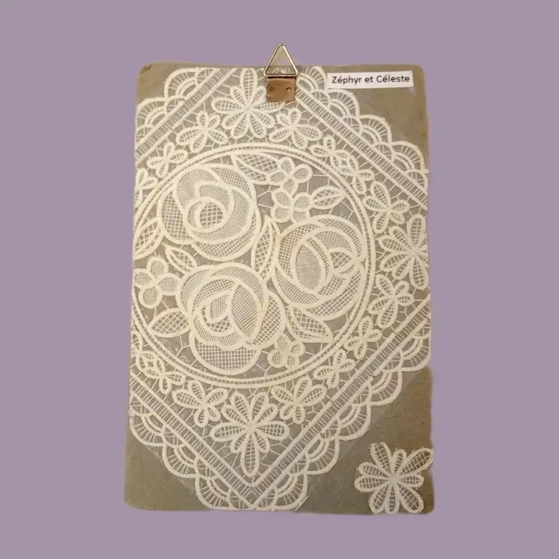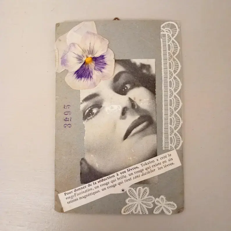 Carton publicitaire (vintage), photo ancienne, fleur séchée, réclame ancienne, dentelle plastifiée.