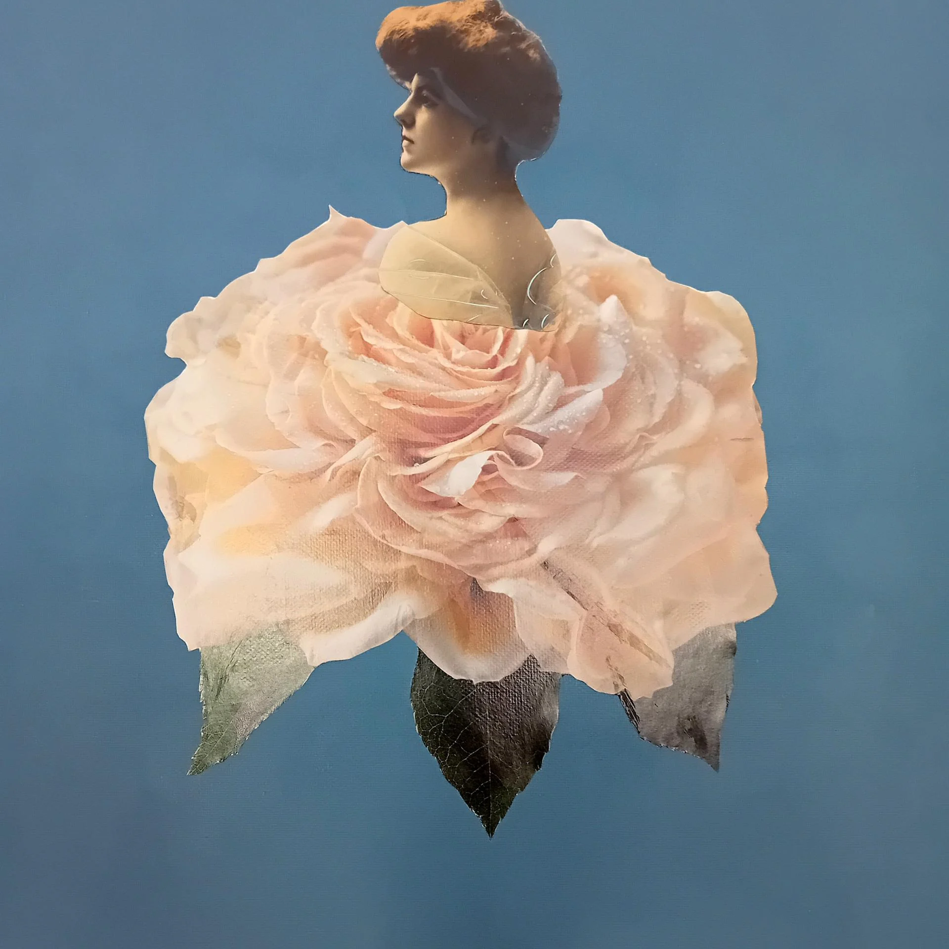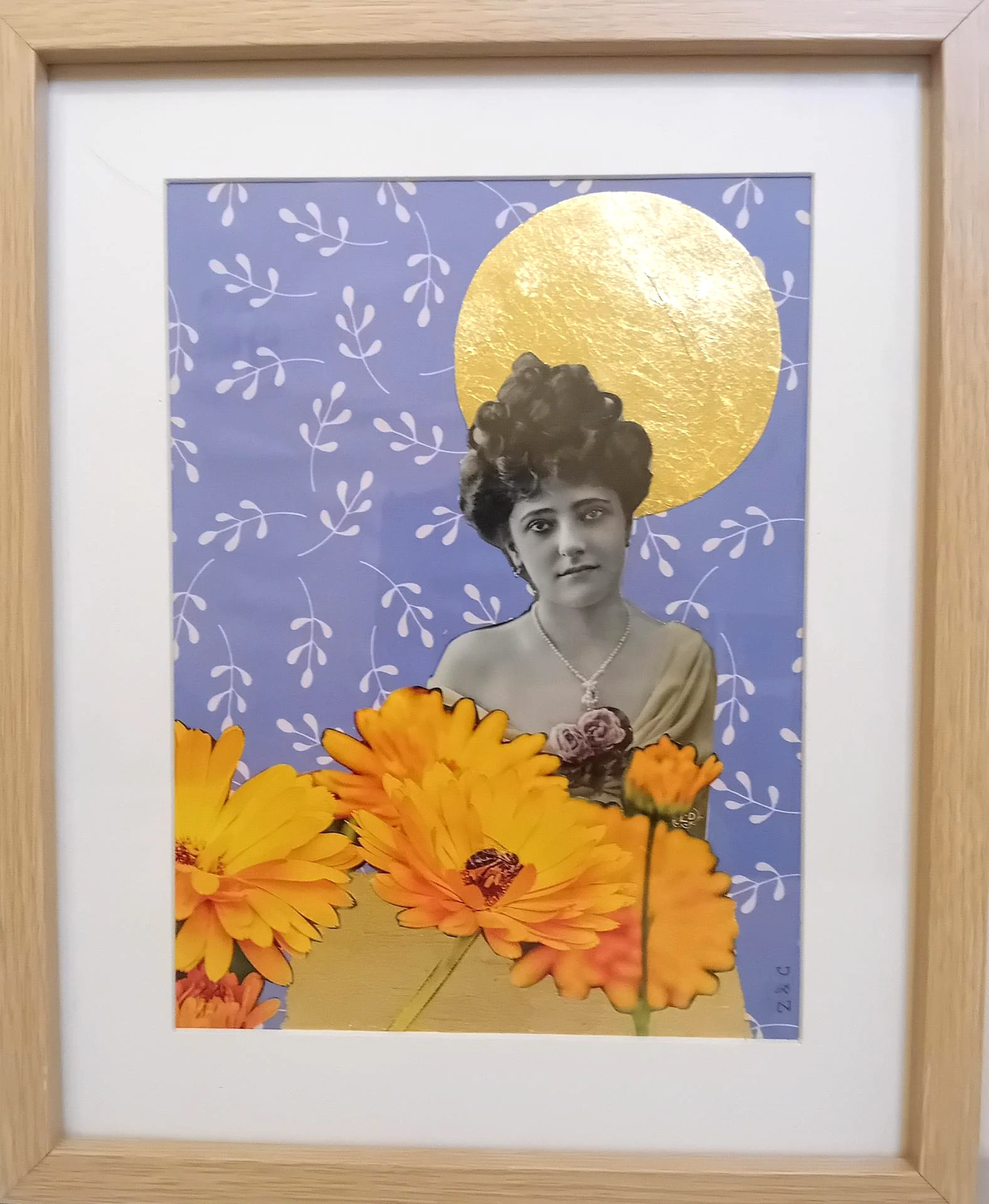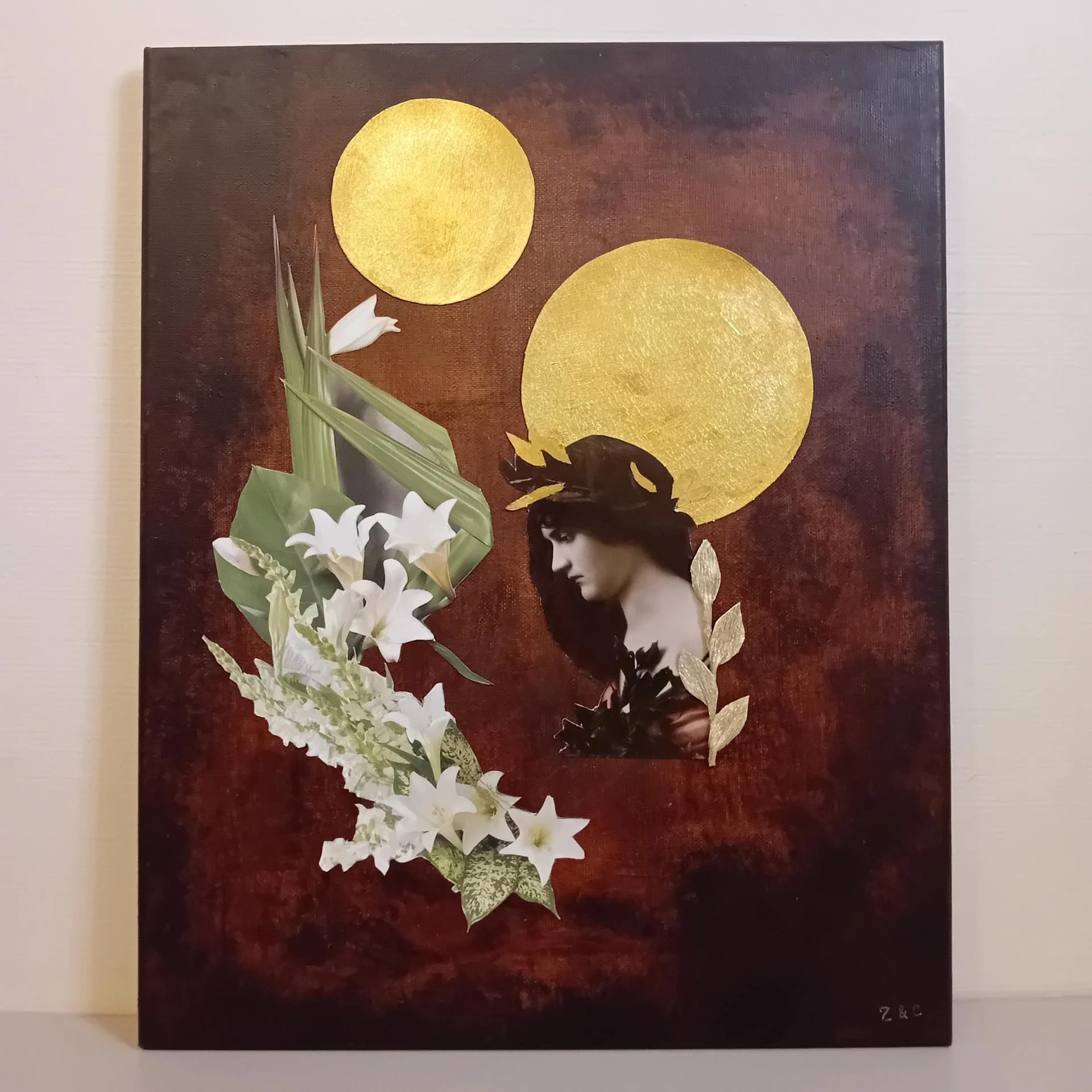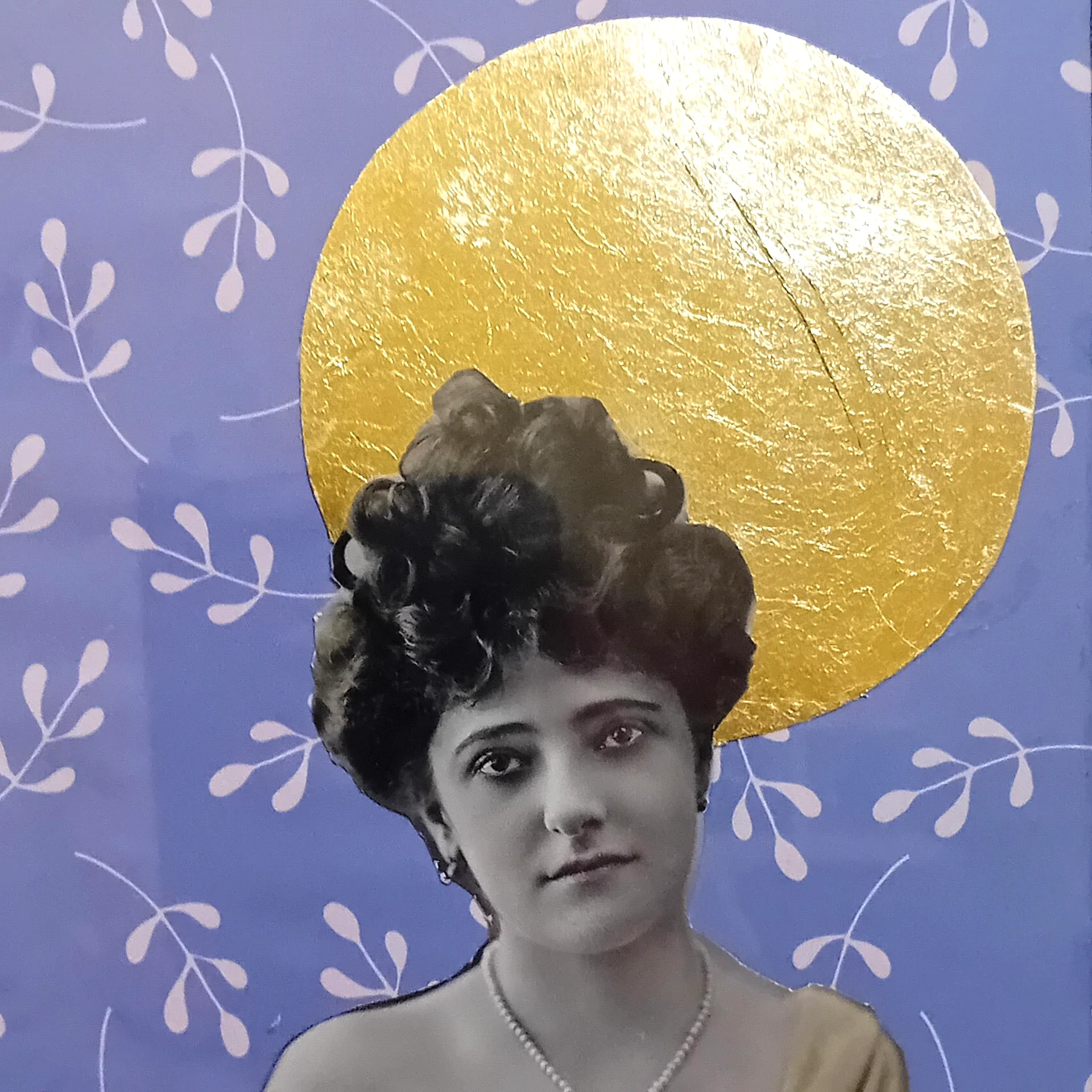 Toile sur chassis, photo ancienne, peinture acrylique, illustrations, fil de fer, papier crépon doré, feuille d'or.